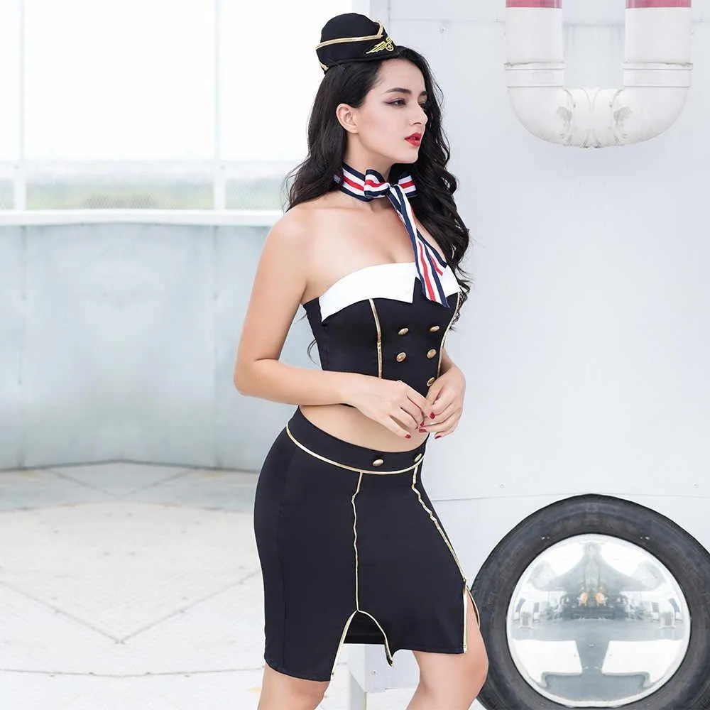 Костюм состоит из обтягивающих топа и юбки с вырезами, которые смогут выгодно подчеркнуть каждый соблазнительный изгиб Вашей фигуры. Наденьте головной убор с эмблемой авиакомпании и повяжите галстук для придания образу завершенности и убедительности.