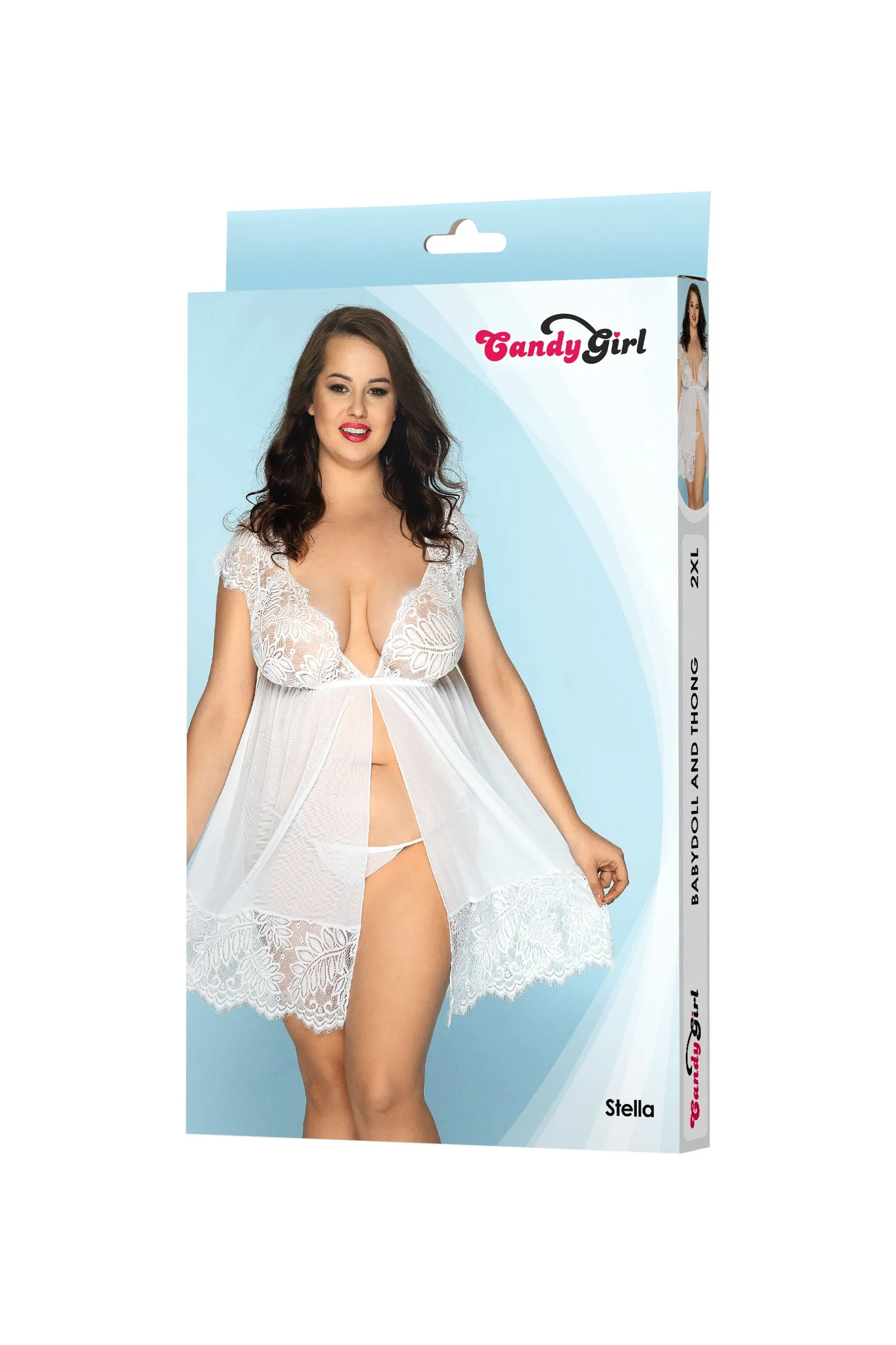 Нежный и изящный образ легко создать с комбинацией и Т-стрингами Candy Girl® Stella. Силуэт бэби-долл зрительно удлиняет ноги, и переносит акцент на соблазнительную грудь. Глубокое декольте, вырез на спине и игривый разрез спереди открывают нежные участки тела для прикосновений и поцелуев. Образ притягательной соблазнительницы граничит с невинным обольщением. Изящное кружево подчеркивает гладкость и мягкость кожи. Пусть на первый взгляд образ в наряде Stella покажется неприступным, но завязки на спине помогают освободить грудь в считанные мгновения, а игривый, но откровенный разрез подола открывает доступ к самым интимным местам.