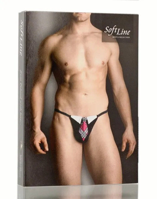 Стринги, из черной непрозрачной ткани, декорированные элегантной имитацией контрастного воротника и черно-розового галстука в клеточку.