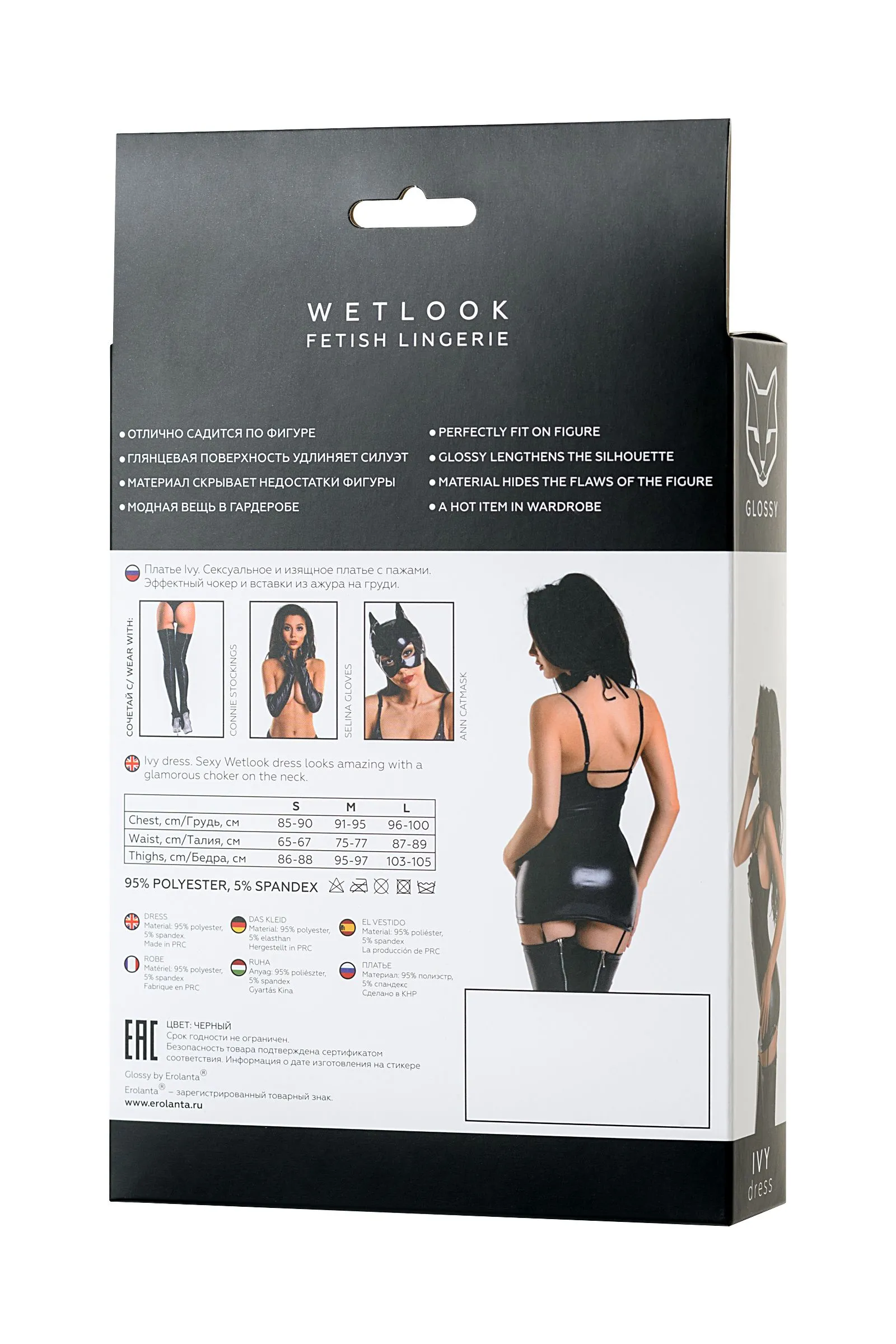 Новая коллекция белья из популярного материала Wetlook – Glossy. WETLOOK: Отлично садится по фигуре; Глянцевая поверхность визуально удлиняет силуэт; Плотный материал скроет мелкие недостатки фигуры; Модная вещь в сексуальном и базовом гардеробе. Платье Ivy Черное блестящее платье из материала Wetlook. Ажурная оконтовка в зоне декольте образует сексуальный чокер на шее. Пажи помогут сделать образ еще более сексуальным, добавив чулки.