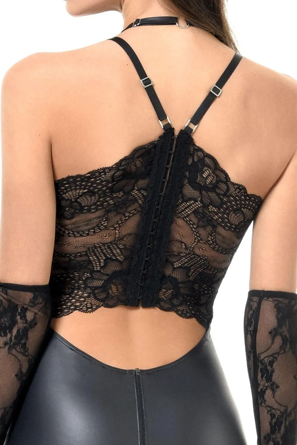 Элегантное платье Lydia из коллекции Tome 14.2 от французского модельера Patrice Catanzaro выполнено из сочетания плотного черного материала, имитирующего мокрую кожу, и полупрозрачного кружева с цветочным мотивом. Короткое платье будет плотно облегать фигуру, волнительно очерчивая все ее соблазнительные изгибы. Вырез в области декольте украшен небольшим пикантным бантиком с подвеской. Сзади платье застегивается на молнию и крючки. Бретельки регулируются.