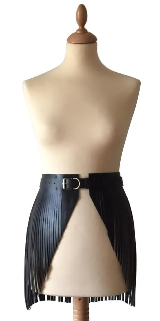 Юбка с бахромой выполнена из натуральной кожи черного цвета. Ремень съемный. Обхват талии от 60 до 89 см. Максимальная длина: 40 см.