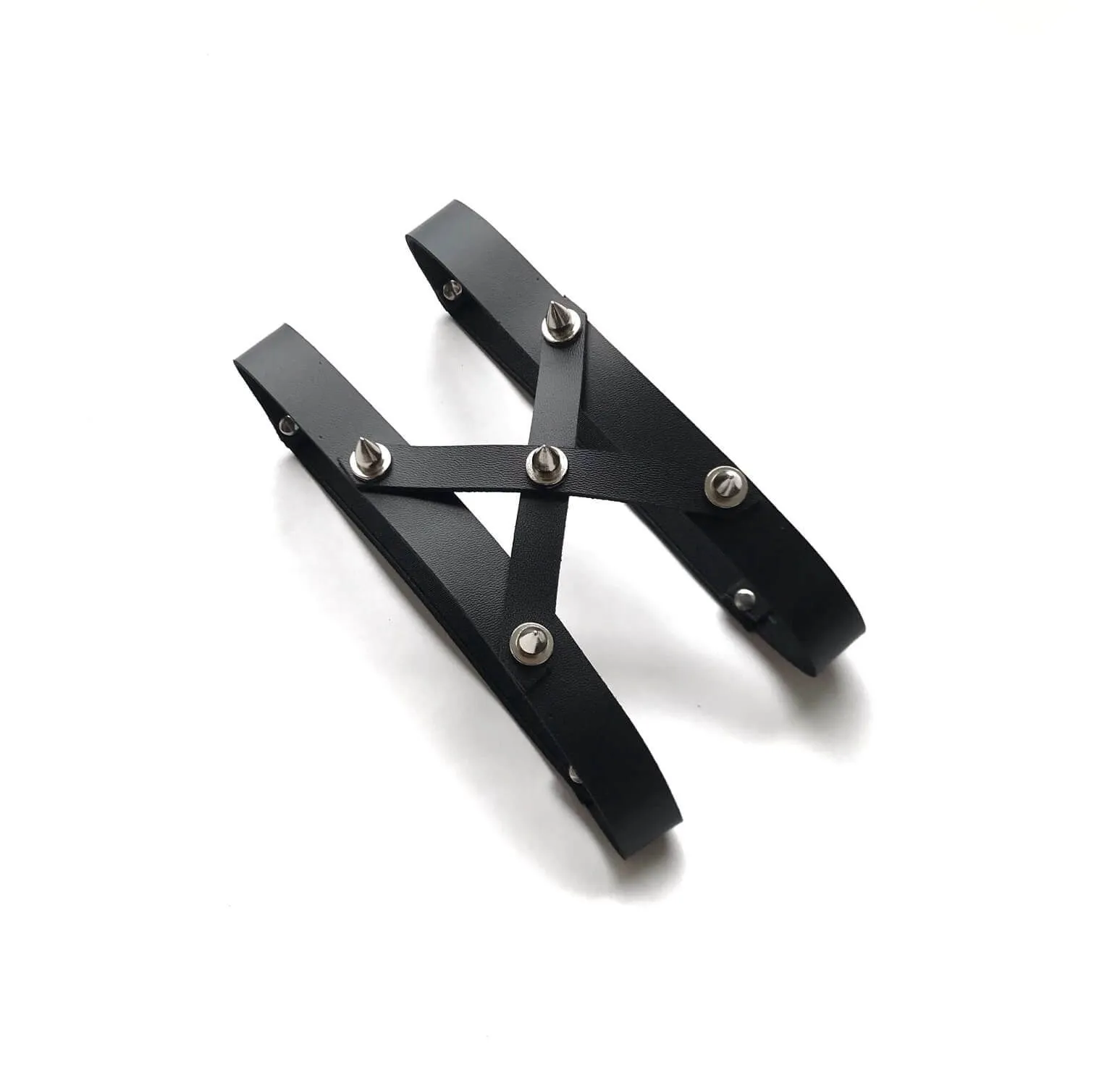 Подвязка на ногу от российского бренда Pink Rabbit выполнена из натуральной кожи черного цвета и украшена 5 металлическими шипами. Подвязка состоит из двух ремешков, соединенных между собой перекрещивающимися полосками кожи. На ножке она будет держаться при помощи эластичной резинки. Такой необычный аксессуар можно носить как самостоятельно, так и вместе с чулками для создания более эффектного образа. Подвязка станет интересной и соблазнительной деталью ролевого костюма, который вызовет восхищение у Вашего партнера.