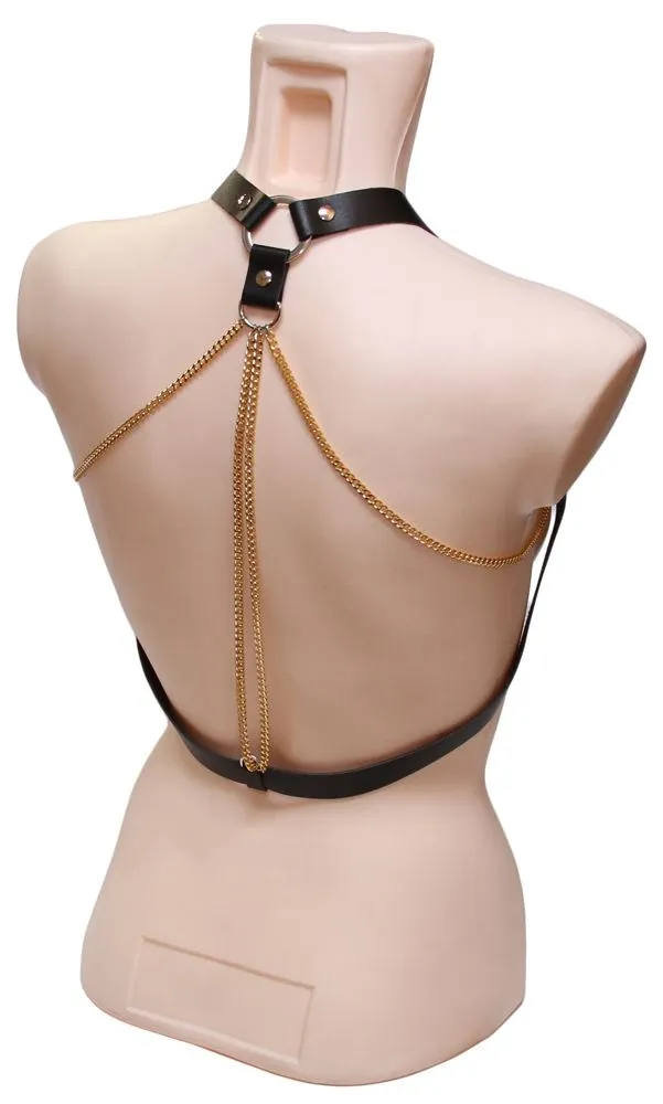 Если Вы хотите выглядеть соблазнительно и дерзко, то эта портупея отлично Вам подойдет! Она выполнена из натуральной кожи, сзади декорирована золотистыми цепочками, волнующе ниспадающими по спине. Вы можете надеть эту портупею на голое тело во время любовных игр или носить ее вместе с одеждой, чтобы подчеркнуть свой уникальный стиль.