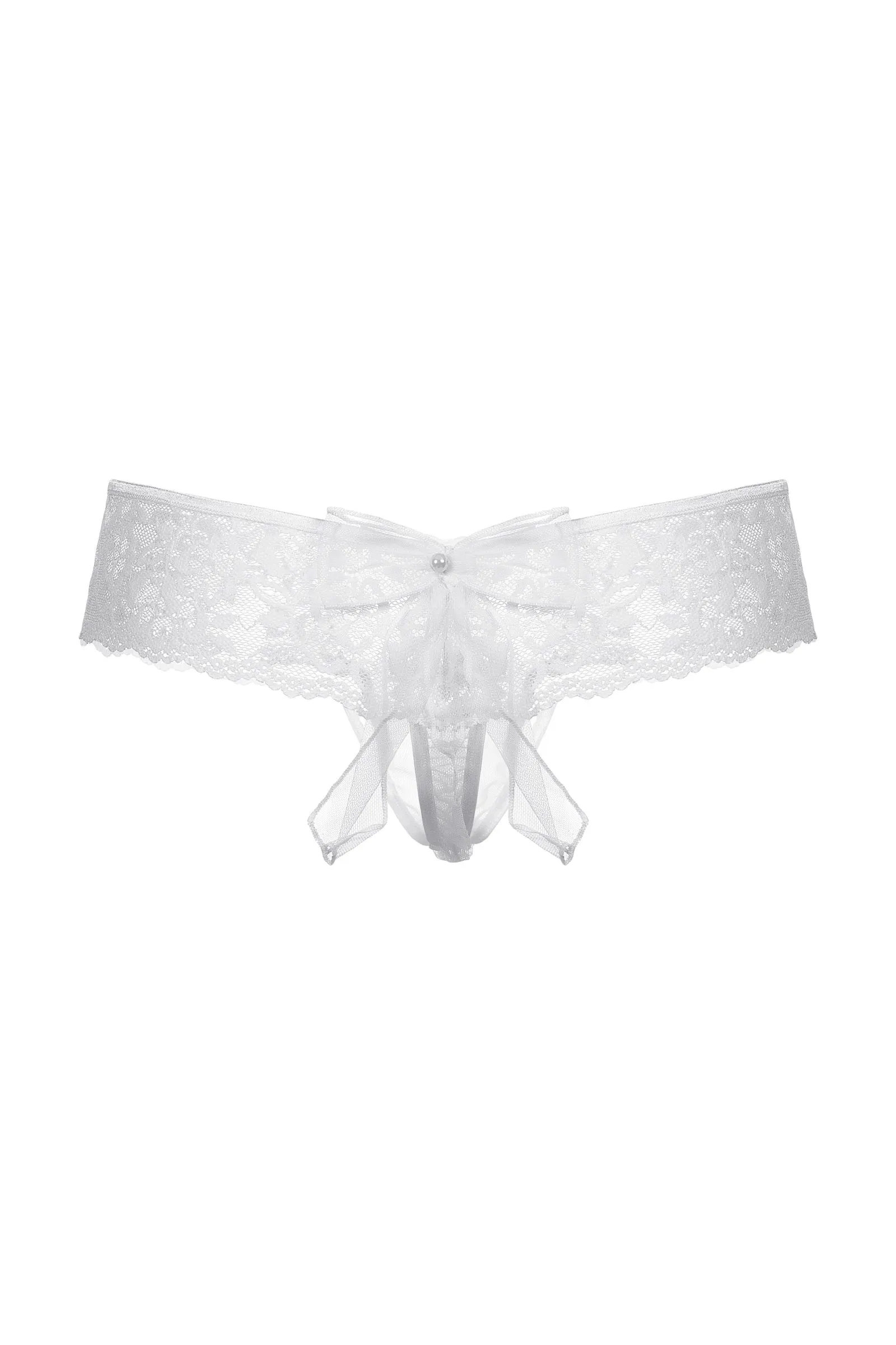 Шикарные кружевные трусики с открытым доступом. Роскошное кружево облегает соблазнительные изгибы бедер и ягодиц. Два маленьких бантика с крошечными бусинами притягивают взгляд. Интригующий бант из тюля, как вишенка на торте, завершает сексуальный образ.