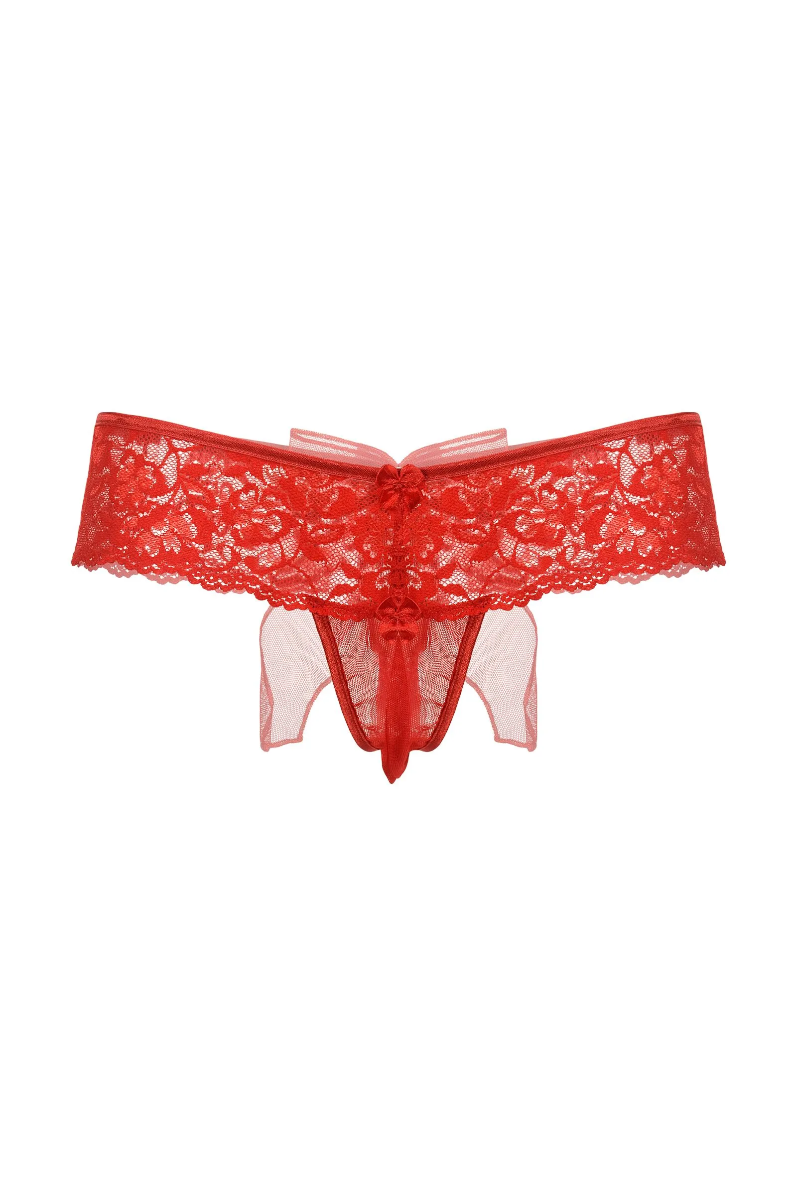 Шикарные кружевные трусики с открытым доступом. Роскошное кружево облегает соблазнительные изгибы бедер и ягодиц. Два маленьких бантика с крошечными бусинами притягивают взгляд. Интригующий бант из тюля, как вишенка на торте, завершает сексуальный образ.