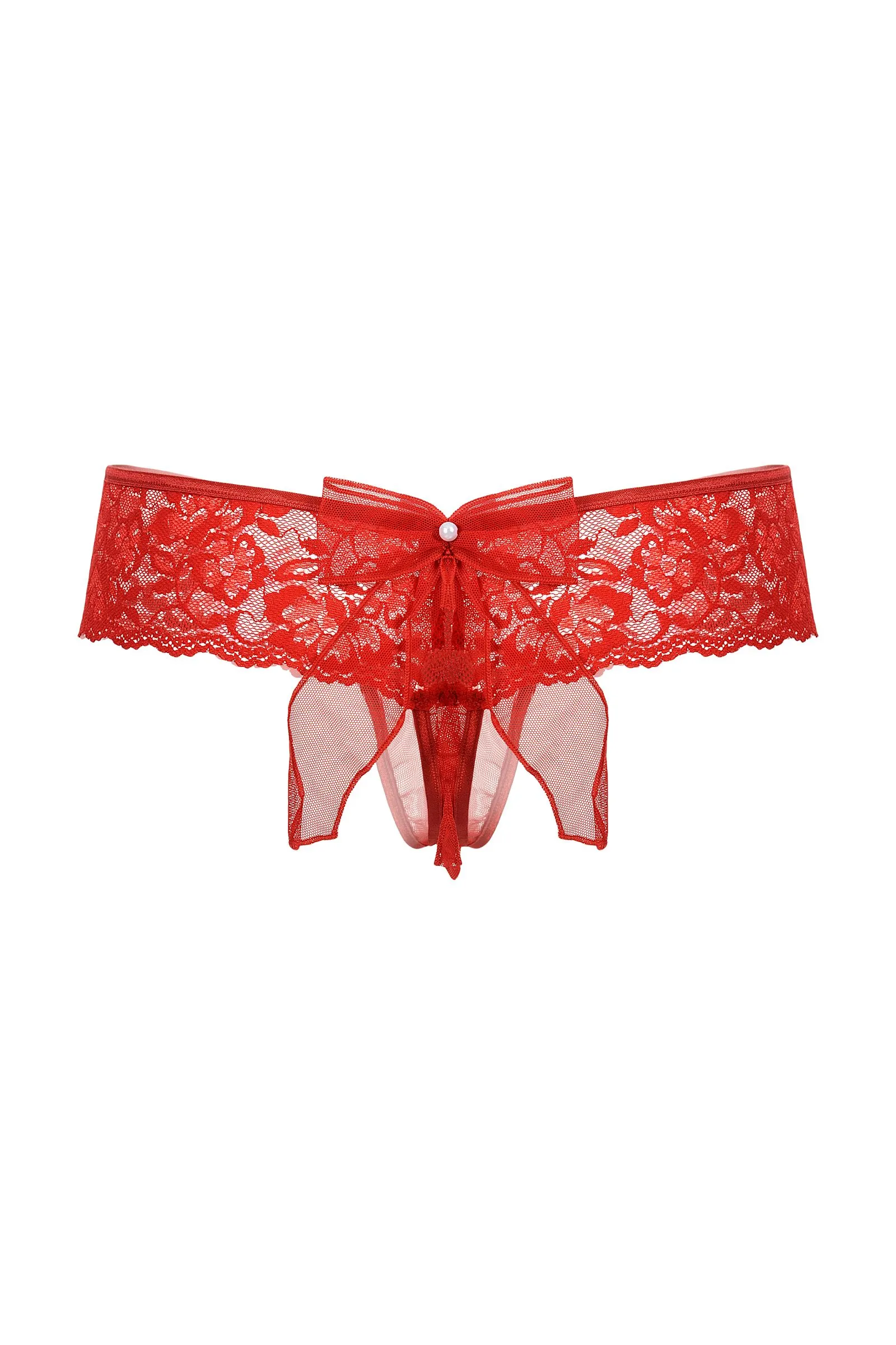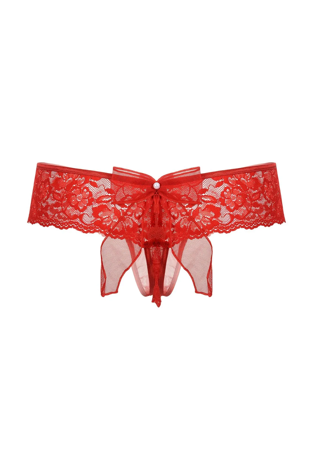 Шикарные кружевные трусики с открытым доступом. Роскошное кружево облегает соблазнительные изгибы бедер и ягодиц. Два маленьких бантика с крошечными бусинами притягивают взгляд. Интригующий бант из тюля, как вишенка на торте, завершает сексуальный образ.