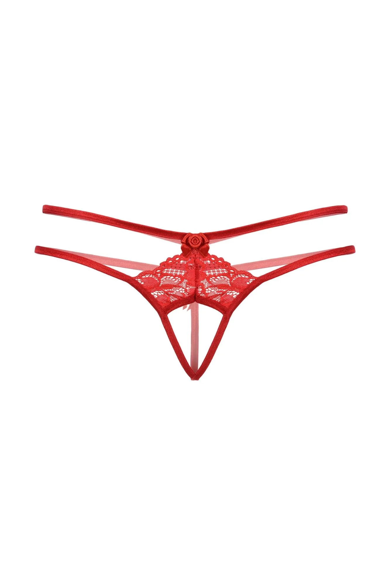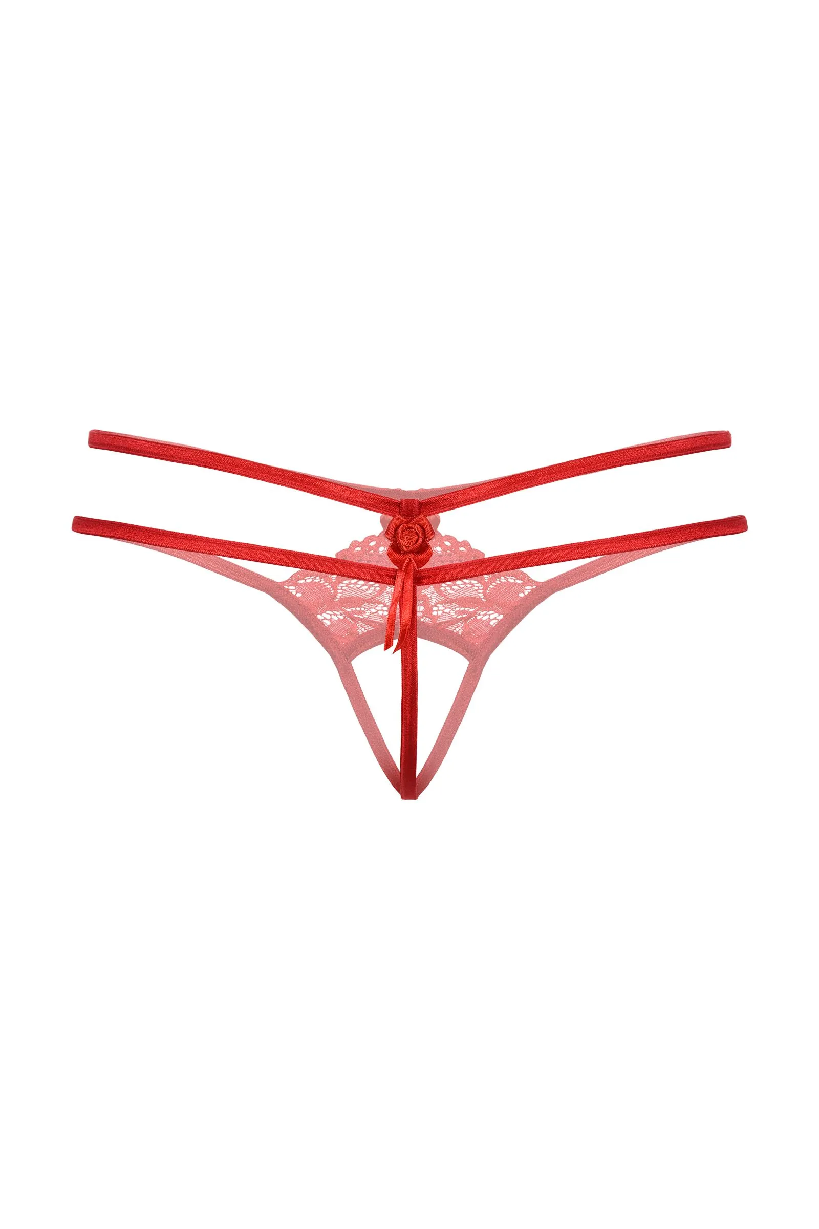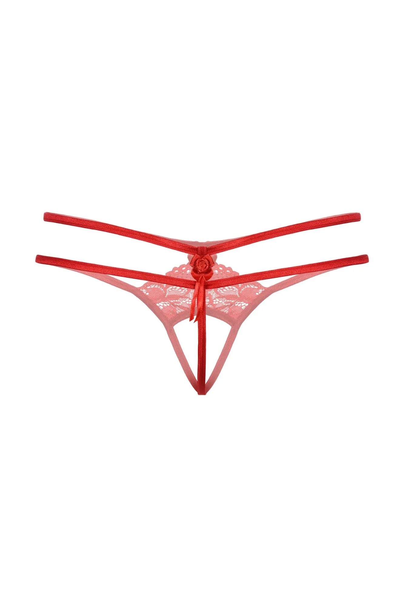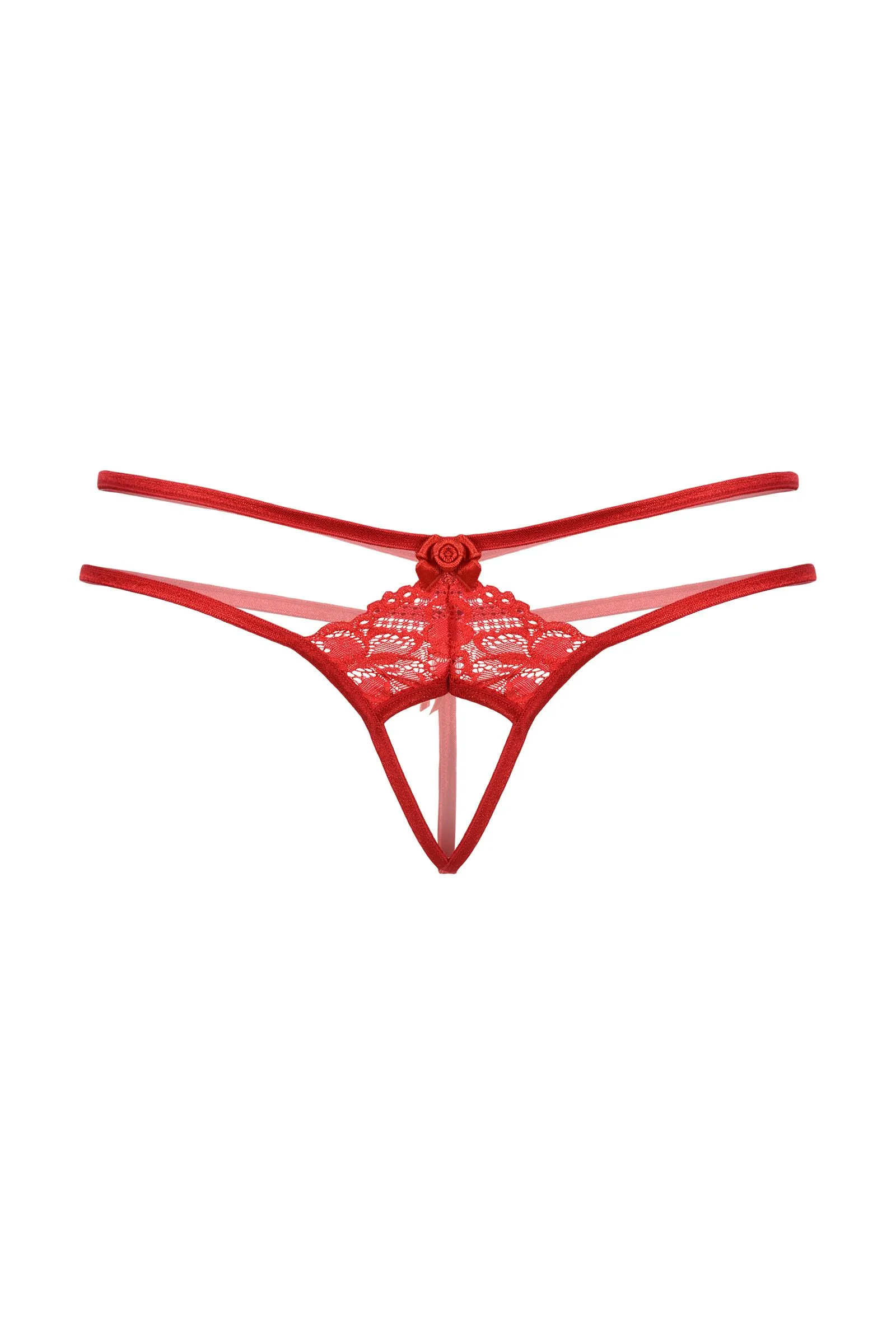 Кружевные стринги с открытым доступом. Спереди и сзади декорированы маленькими бантиками. Оригинальное сочетание нежного кружева и переплетения тесьмы.