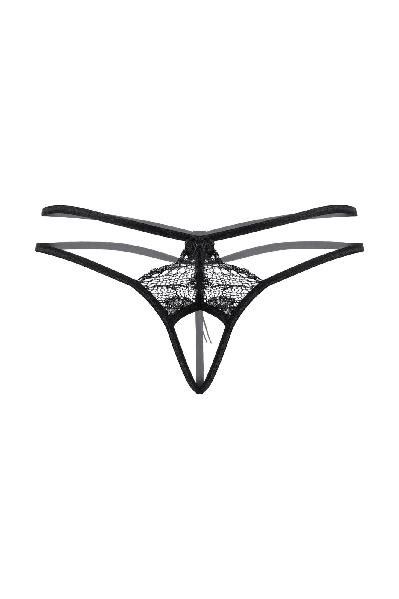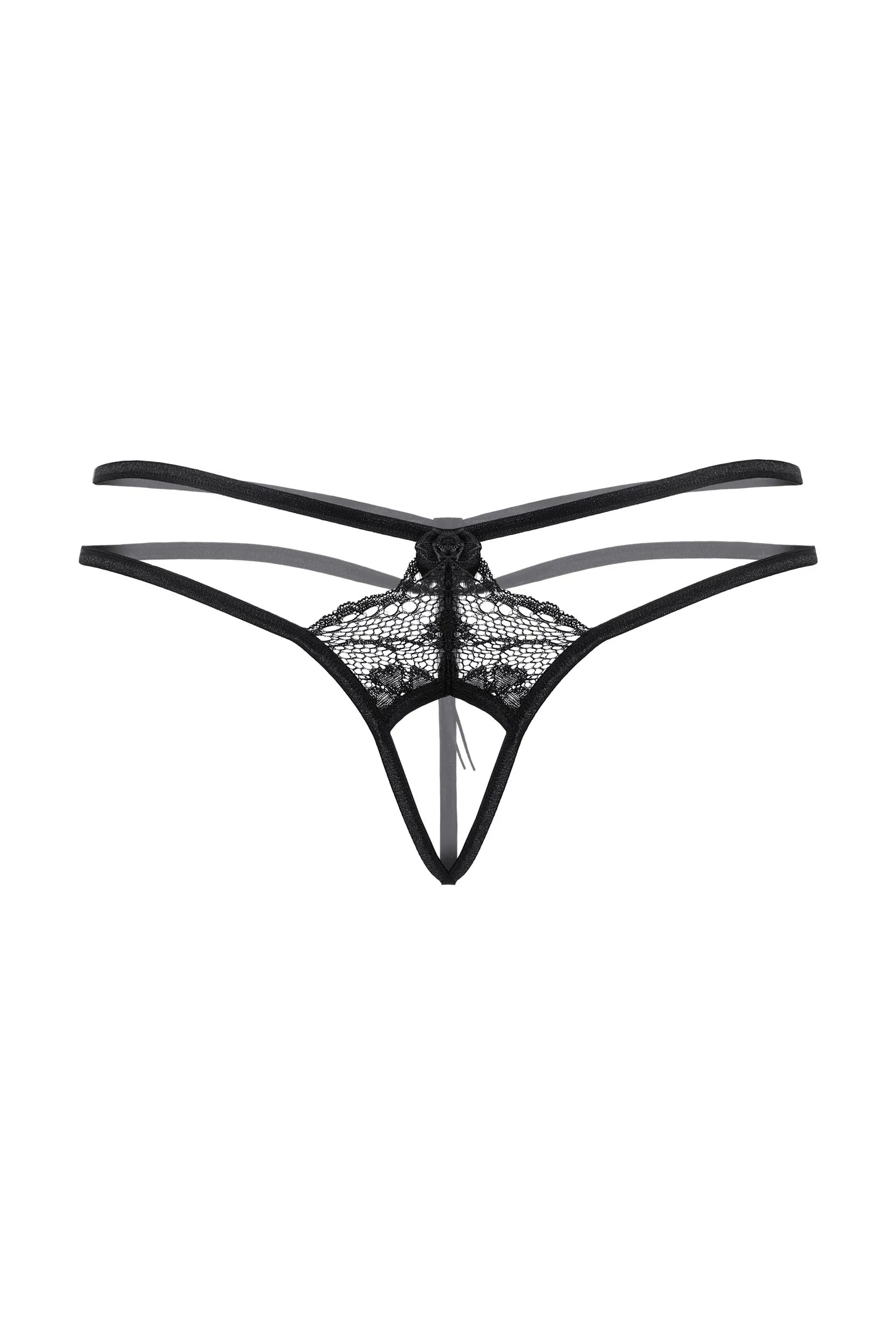 Кружевные стринги с открытым доступом. Спереди и сзади декорированы маленькими бантиками. Оригинальное сочетание нежного кружева и переплетения тесьмы.