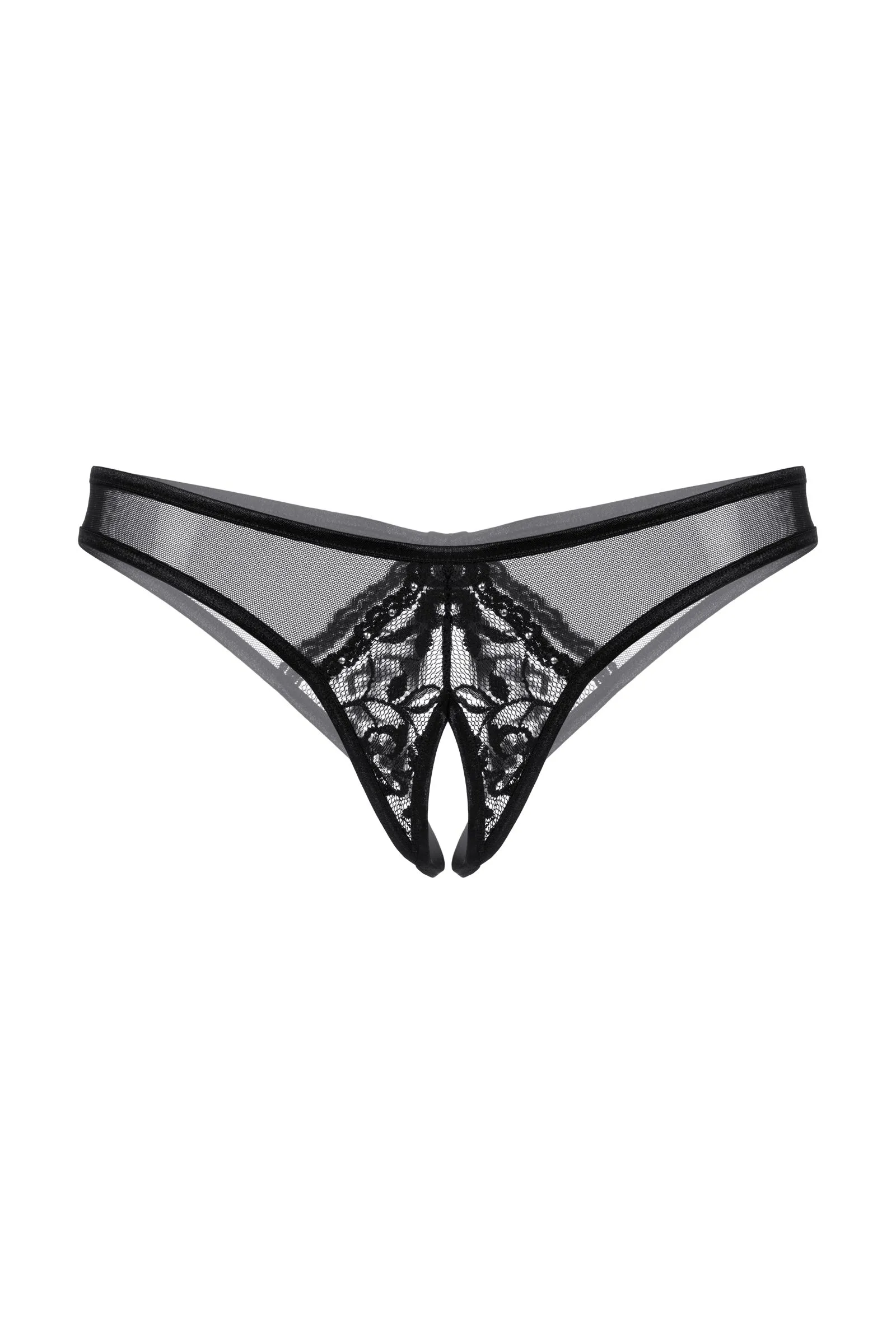 Трусы с доступом, выполненные из тонкой сетки в сочетании с кружевом, декорированы стразами.