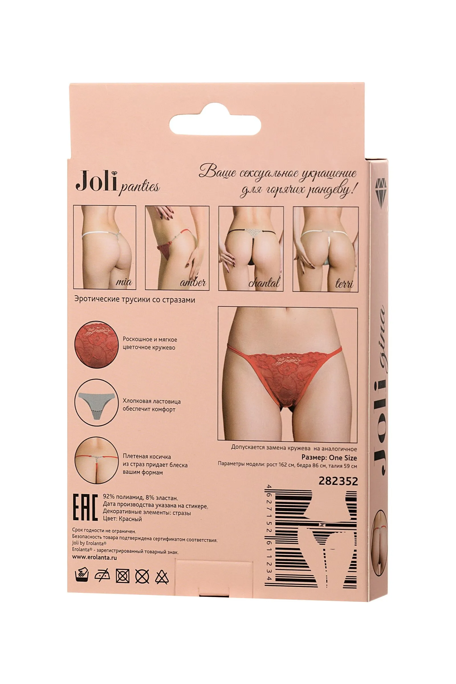 Joli panties – ваше сексуальное украшение для горячих рандеву! Новая линейка романтичного белья Joli (в пер. с французского красивая) радует глаз элегантными деталями и нежными материалами европейского качества. Изящное кружево с цветочным орнаментом спереди. Плетеная косичка из страз у основания ягодиц придает сексуальному образу блеска и яркости. Joli panties – выбери украшение для обольщения!