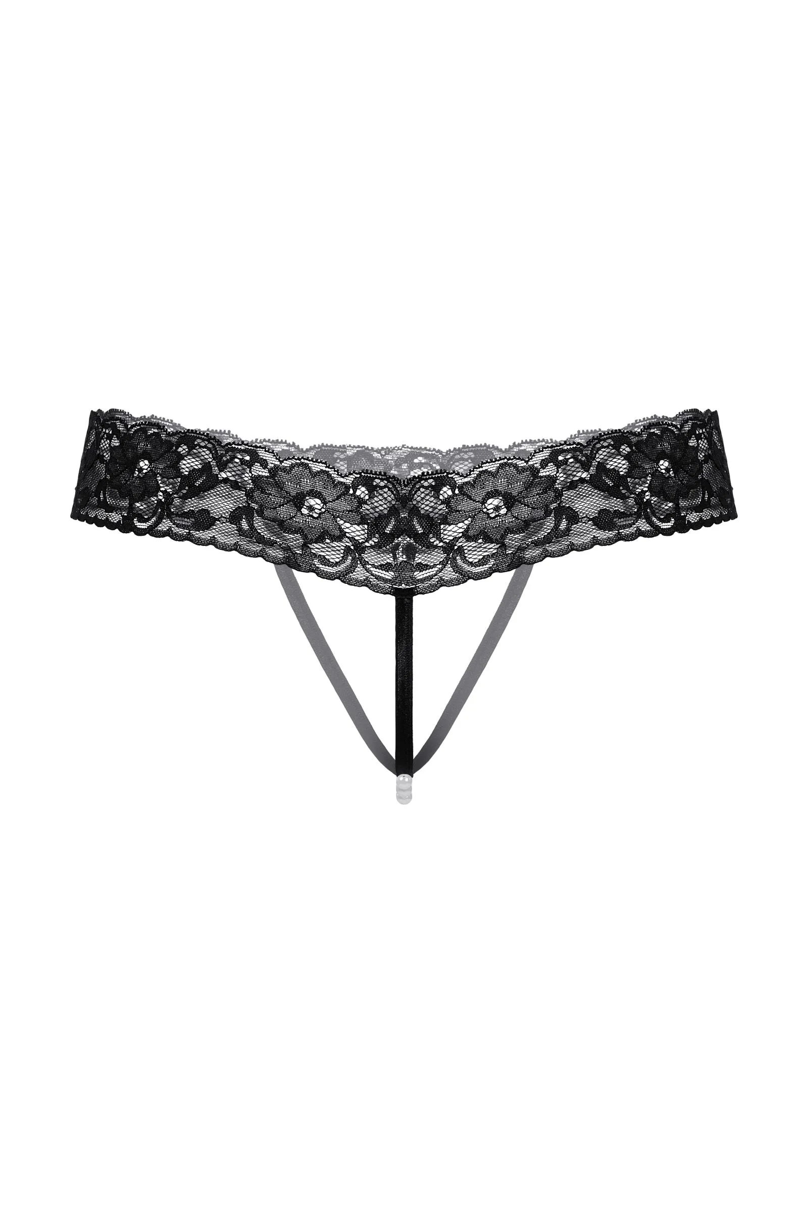 Кружевные стринги с открытым доступом. Спереди декорированы кокетливым бантиком и нитью "жемчуга". Оригинальная кружевная резинка подчеркивает линию бедер.