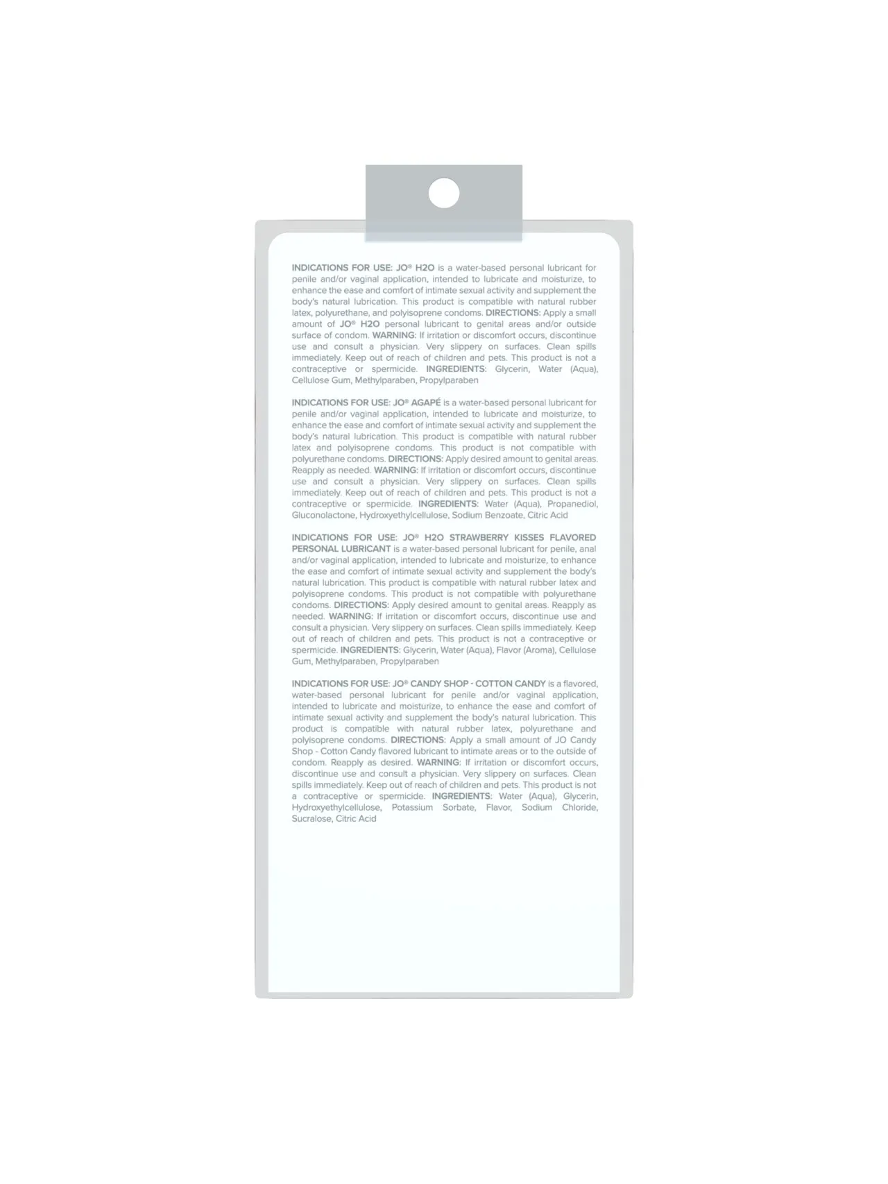 Набор состоит из восьми саше популярных интимных лубрикантов: нейтральный лубрикант на водной основе JO H2O (2 шт.), персональный любрикант на водной основе для женщин JO AGAPE LUBRICANT ORIGINAL (2 шт.), персональный вкусовой любрикант JO H2O Strawberry Kiss (2 шт.), JO H2O персональный любрикант на водной основе (2 шт.).