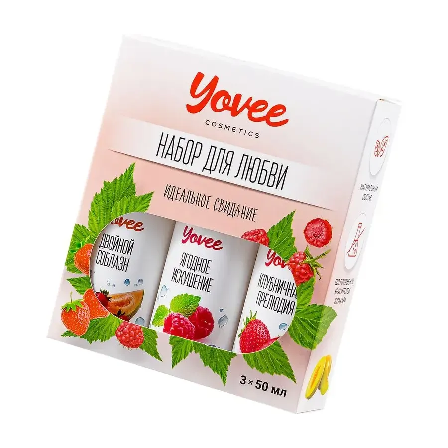 "Набор для любви" от бренда Yovee идеально подходит для эротических экспериментов. В одной упаковке три съедобных, увлажняющих геля на водной основе. Первый обладает сочным вкусом и ароматом клубники, второй - соблазнительной клубники и дыни, третий - малиновой нежностью с волнующими нотами мяты. Используйте самостоятельно или создайте свой вкус, смешивая их! Несмотря на сладость, гели не содержат сахара в составе, не нарушают микрофлору и pH-баланс. Подходят как для вагинального, так и для орального секса. Совместимы со всеми видами презервативов и игрушек для взрослых.