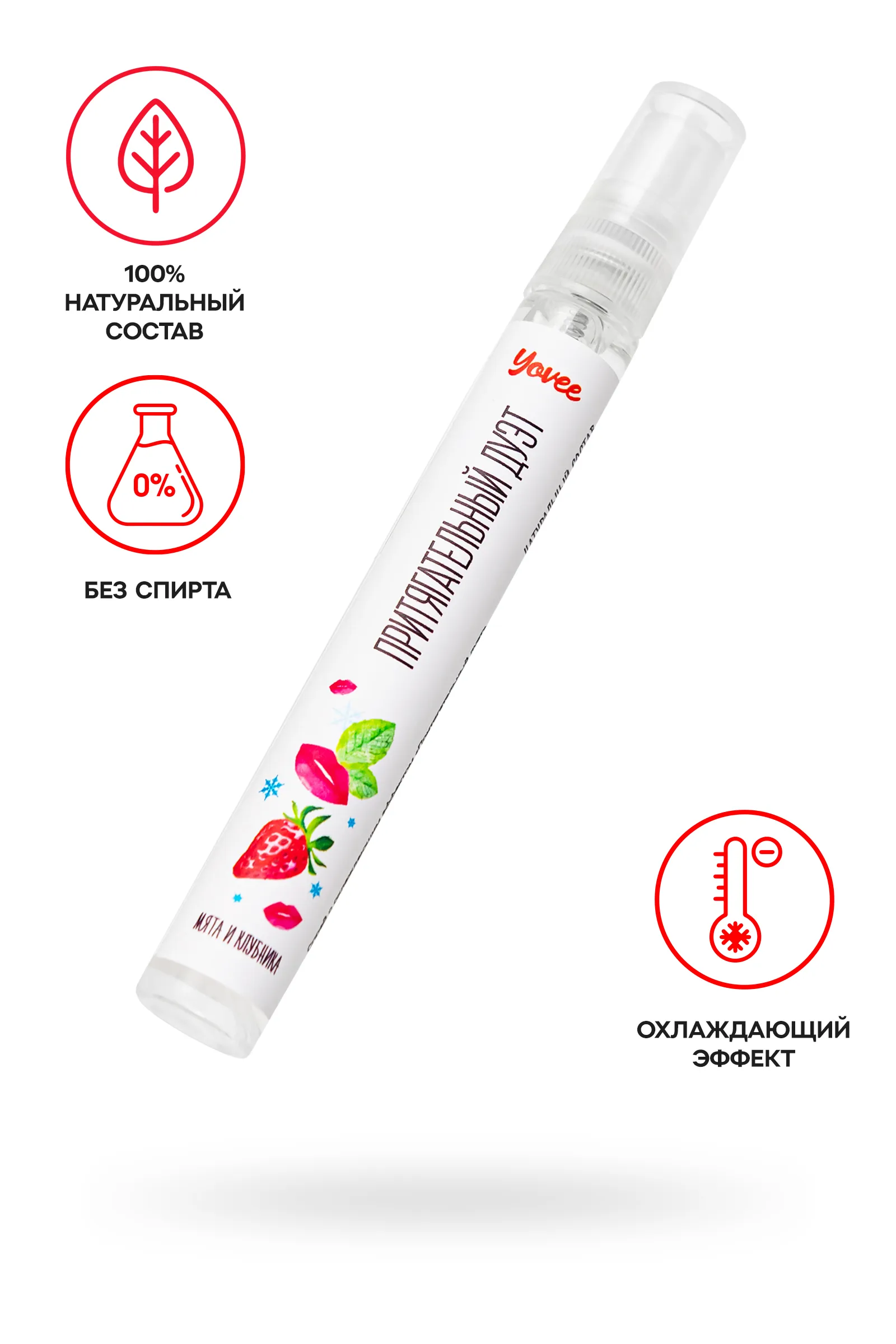 Обладая соблазнительным мятно-клубничным вкусом и приятным охлаждающим эффектом спрей Yovee «Притягательный дуэт» усиливает удовольствие от секса и делает интимную игру еще более пикантной. Применение спрея притупляет рвотный рефлекс и помогает освоить технику "глубокая глотка". Также спрей можно использовать для усиления чувствительности нервных окончаний сосков. Под воздействием активных компонентов восприимчивость эрогенных зон станет выше, а ласки еще более приятными. Распылять средство нужно непосредственно перед оральным сексом. Длительность эффекта зависит от количества нанесенного спрея. Применение: встряхните, распылите 2-3 дозы и подождите несколько секунд, чтобы почувствовать эффект. Освежает дыхание Усиливает слюноотделение Оказывает охлаждающее и возбуждающее воздействие Нейтрализует рвотный рефлекс, помогает применить технику "глубокая глотка" Дарит новые ощущения Активные ингредиенты: Ментол - основной компонент эфирного масла, содержащегося в листьях мяты перечной. Избирательно раздражая холодовые рецепторы, вызывает ощущение холода, жжения, покалывания с последующим небольшим понижением чувствительности. Эфирное масло эвкалипта - афродизиак мягкого действия. Повышает сексуальную энергию, вселяет уверенность, придает силы, восстанавливает утраченные силы. Благодаря свойству эвкалиптового масла подавлять канцерогенные оральные бактерии, его часто используют в средствах для освежения дыхания и оздоровления полости рта.