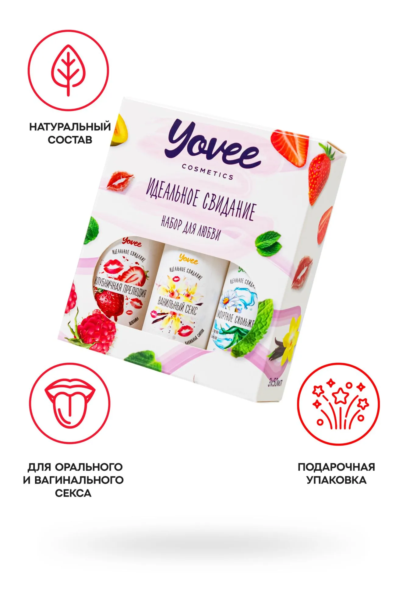 Набор интимных гелей "Набор для любви" от бренда Yovee - это отличный повод попробовать все и сразу. Набор состоит из трех интимных гелей-смазок: один без вкуса и запаха и два с яркими насыщенными вкусами и ароматами. Увлажняющий интимный гель-смазка с алоэ и ромашкой обеспечит долгое скольжение, увлажнение и смягчение слизистой. Съедобный гель с ярким вкусом и ароматом сладкой клубники или нежным сливочным вкусом с нотами ванили придаст оральному сексу еще больше пикантности и удовольствия. Каждый гель можно использовать как самостоятельно, так и смешав два или три геля и создав новый вкус клубники со сливками, либо скорректировать уровень сладости при помощи геля "Комфортное скольжение". Гели подходят как для вагинального, так и для орального секса. Совместимы со всеми видами презервативов и игрушек для взрослых. ИДЕАЛЬНЫЙ ПОДАРОК ВОЗМОЖНОСТЬ СОЗДАТЬ СВОЙ ВКУС Все гели Yovee имеют простой и безопасный состав: вода; гидроксиэтилцеллюлоза - стабилизатор эмульсий, регулятор вязкости; Д-пантенол защищает слизистые, запускает процесс регенерации тканей; сорбат калия и бензоат натрия – безопасные пищевые консерванты, разрешенные в натуральной и органической косметике; лимонная кислота помогает поддерживать оптимальный уровень рН, является естественным консервантом. БЕЗ ГЛИЦЕРИНА БЕЗ ПАРАБЕНОВ БЕЗ КРАСИТЕЛЕЙ БЕЗ САХАРА Комплектация: Увлажняющая гель-смазка Yovee «Комфортное скольжение» с Д-Пантенолом, алоэ и ромашка, 50 мл Съедобная гель-смазка Yovee «Клубничная прелюдия» с Д-Пантенолом, со вкусом клубники, 50 мл Съедобная гель-смазка Yovee «Ванильный секс» с Д-Пантенолом, со вкусом ванильных сливок, 50 мл