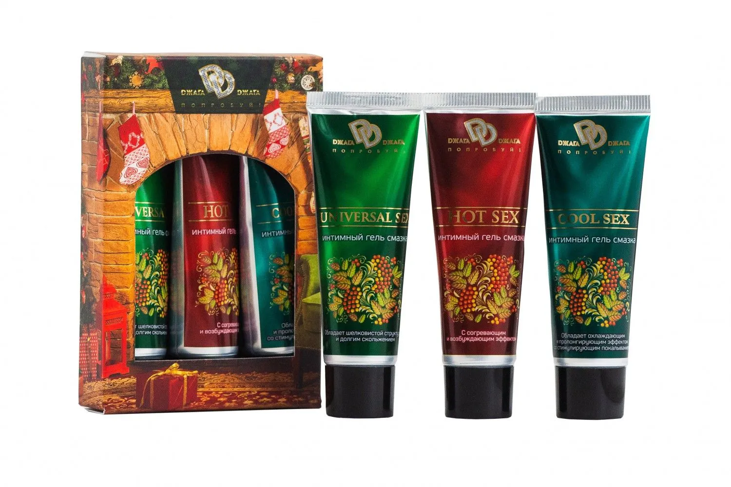 В набор входят три интимные смазки: «СOOL SEX», «UNIVERSAL SEX», «HOT SEX» по 30 мл.