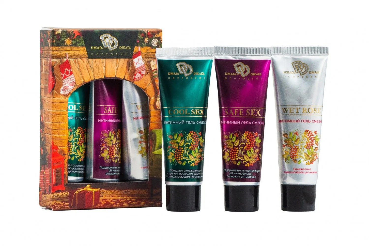 В набор входят три интимные смазки: «SAFE SEX», «СOOL SEX», «WET ROSE» по 30 мл.