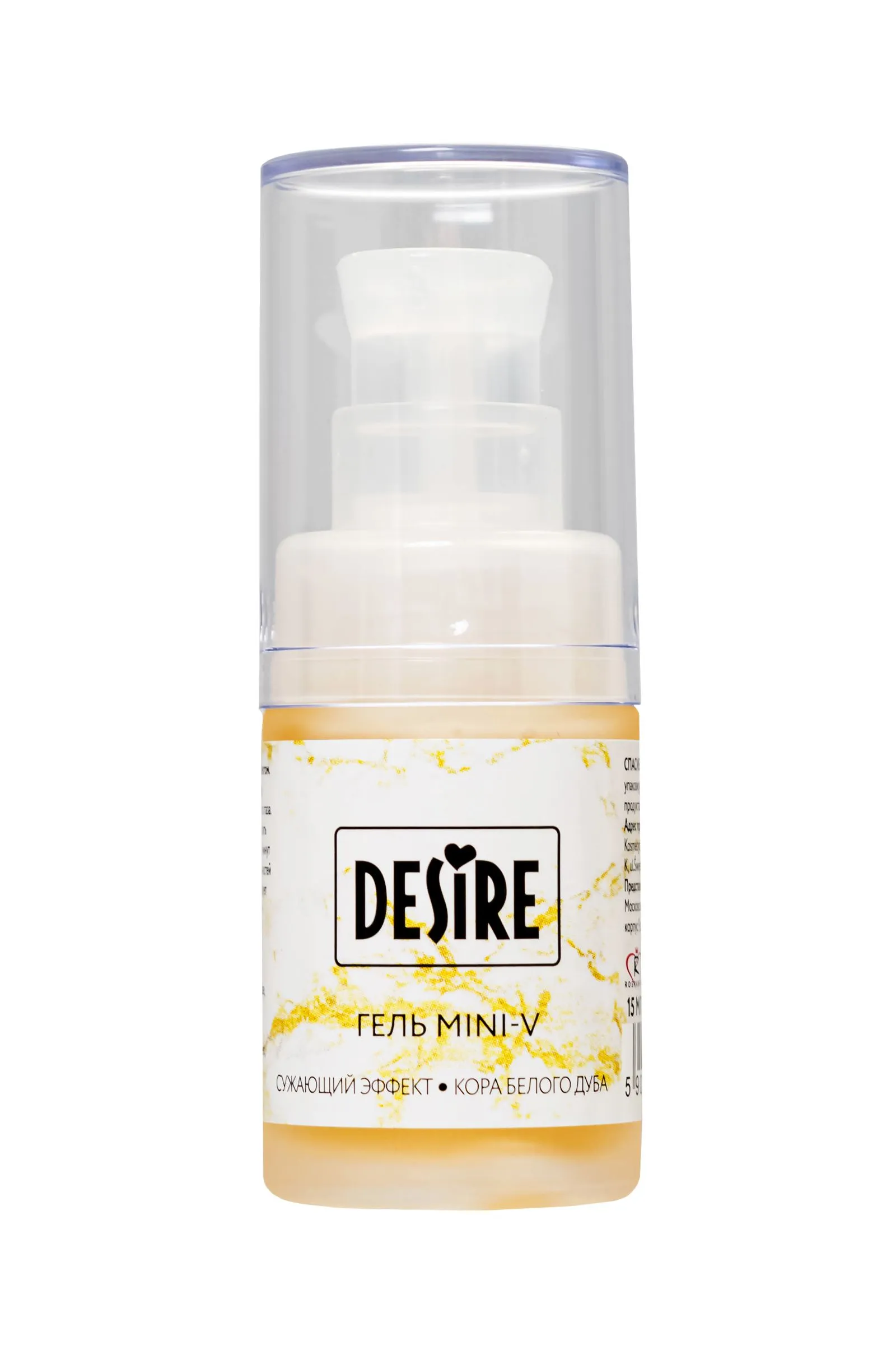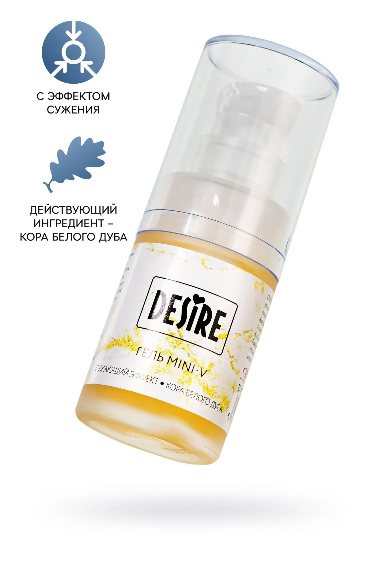 Превратите интимные моменты в настоящие сокровенные удовольствия с сужающим гелем Desire Mini-V. Этот женский интимный гель с эффектом сужения идеально упакован в матовое стекло с удобной помпой, чтобы обеспечить максимальную удобство и дозировку. Уникальная формула геля, обогащенная натуральной корой белого дуба, стимулирует приток крови к органам малого таза, создавая ощущение интенсивной стяжки. Почувствуйте, как ваше удовольствие усиливается, благодаря улучшенному кровообращению и увеличенной чувствительности. Сужающий интимный гель предназначен для женщин, которые хотят усилить ощущения во время интимных отношений и создать более плотное ощущение стяжки. Этот гель помогает повысить чувствительность, улучшить кровообращение и создать ощущение более тесного контакта в области органов малого таза. Он может быть полезен для женщин, желающих усилить свою сексуальную стимуляцию, достичь более ярких оргазмов или просто насладиться новыми ощущениями в интимной области. Сужающий гель также может помочь восстановить упругость после родов или при возрастных изменениях. Для достижения оптимальных результатов рекомендуется наносить гель заранее и дать ему впитаться (время впитывания зависит от индивидуальных особенностей организма и составляет примерно 5-15 минут). Чтобы получить максимальный эффект, рекомендуется постепенно увеличивать дозу средства. Начните с размера горошины и подбирайте индивидуальную дозировку в соответствии с вашими предпочтениями. Дарите себе и своему партнеру незабываемые моменты удовольствия с сужающим гелем Mini-V. Откройте новые грани наслаждения и ощутите полное удовлетворение в каждой интимной встрече. Упаковка - флакон с дозатором, объем 15 мл.