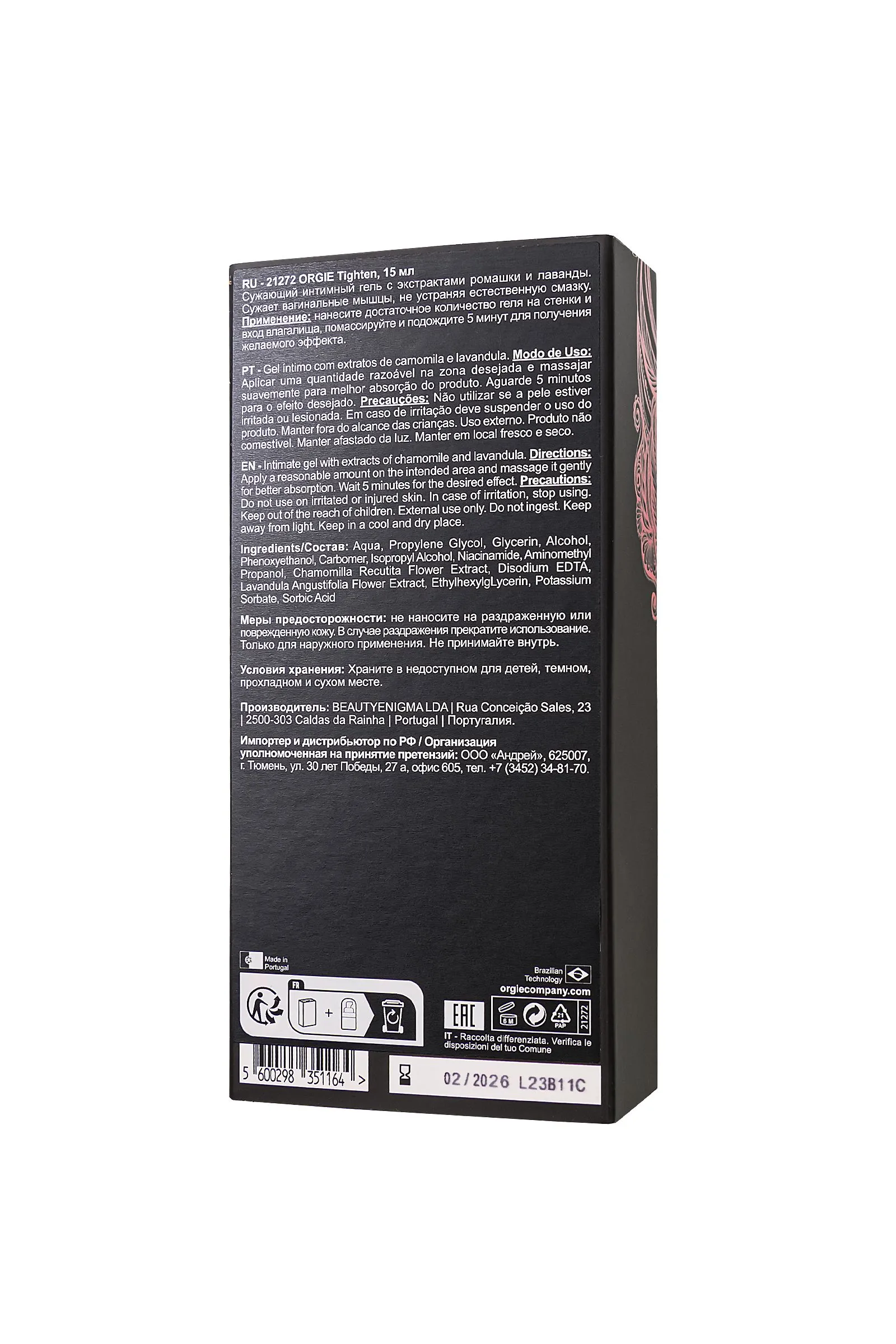 Добро пожаловать в мир совершенства с интимным гелем Tighten от Orgie. Это не просто гель, это произведение искусства, созданное с заботой о вашей уверенности и удовольствии. Обогащенный ценными экстрактами ромашки и лаванды, его формула окутывает вас ощущением нежного стягивания влагалища. Функция интимного геля Tighten - подтягивание и совершенствование. Он делает вагинальные мышцы более упругими и тонизированными, обладает вяжущими свойствами кожи. Забудьте о неудовлетворенности – вы заслуживаете уверенности в себе и непередаваемых ощущений. И главное, он не вызывает никакой сухости, только нежность и комфорт. Удобный флакон с дозатором объемом 15 мл дарит более 75 доз непередаваемой радости. Подтягивание и упругость: Его формула способствует подтягиванию вагинальных мышц, делая их более тонкими и упругими. Вяжущие свойства: Экстракты ромашки и лаванды окутывают вас ощущением нежного стягивания влагалища, придают уверенность и радость. Тонизирующий уход: Гель поддерживает тонус кожи, делая ее более ухоженной и привлекательной. Комфорт и нежность: Tighten предотвращает ощущение сухости и сохраняет комфорт и нежность ваших интимных зон. Применение настолько же удивительно, как и результат. Легкими массирующими движениями нанесите необходимое количество геля на интимные зоны. И если пожелаете, подарите себе этот опыт снова. Этот гель – ключ к новой гармонии и удовольствию. Насладитесь невероятными мгновениями с Tighten!