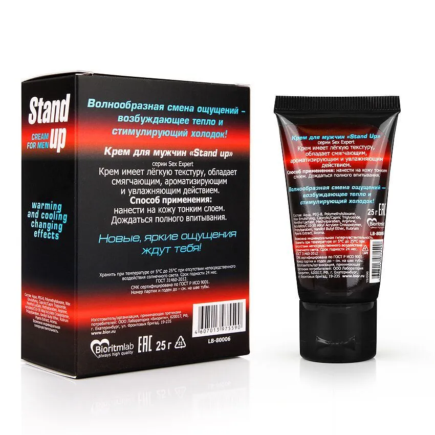 Крем Stand Up от компании Биоритм создан для усиления ощущений у мужчин во время интимной близости. Он не только обладает разогревающим эффектом, но также и повышает уровень сексуального возбуждения и увеличивает чувствительность. Попеременно сменяющиеся ощущения холодка и приятного тепла подарят Вам ни с чем несравнимое удовольствие. Также крем обладает сладким ароматом земляники, который добавит пикантности любовной игре. Действующие компоненты крема - это экстракт красного перца, повышающий чувствительность, и аргинин, положительно влияющий на эрекцию.
