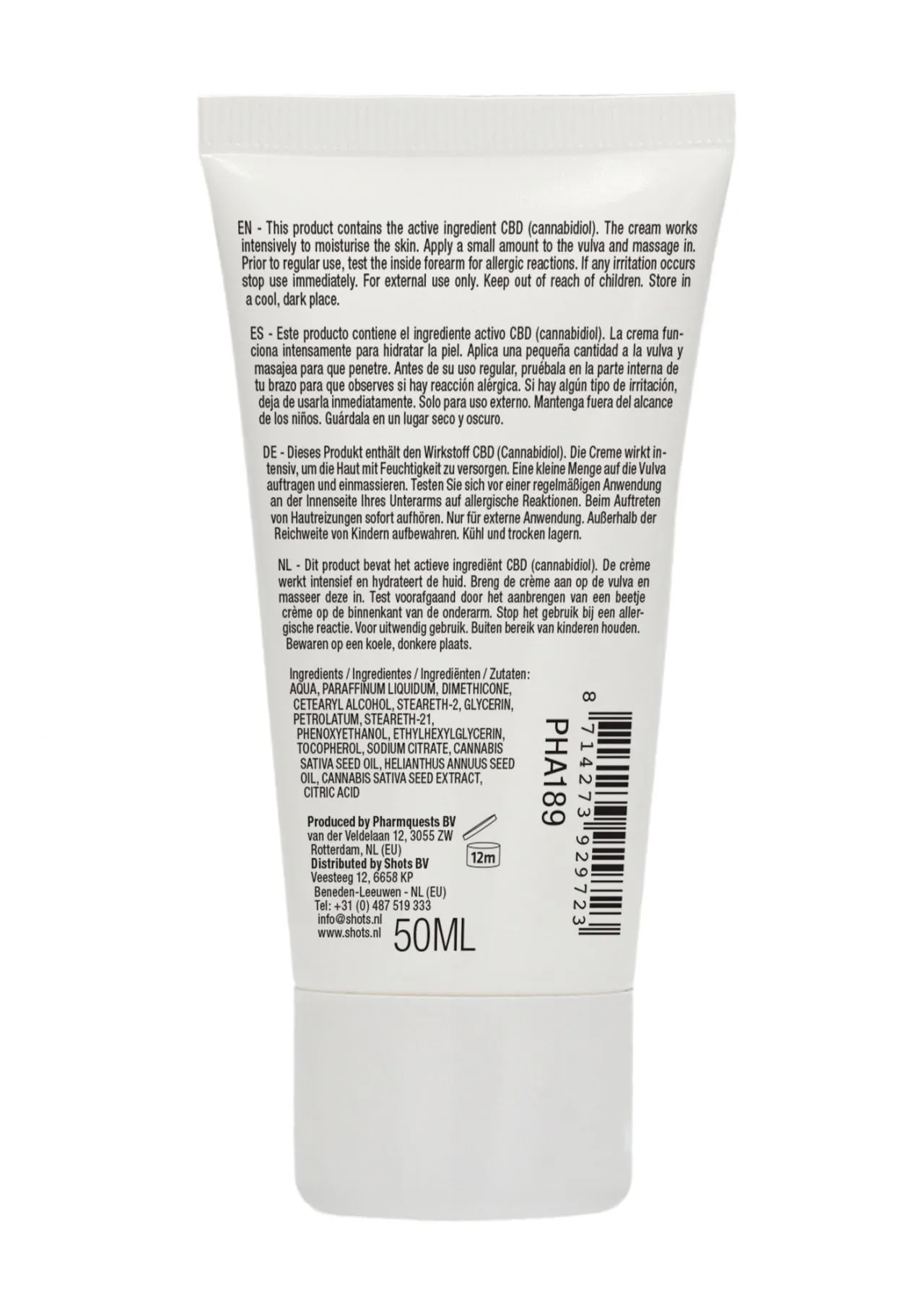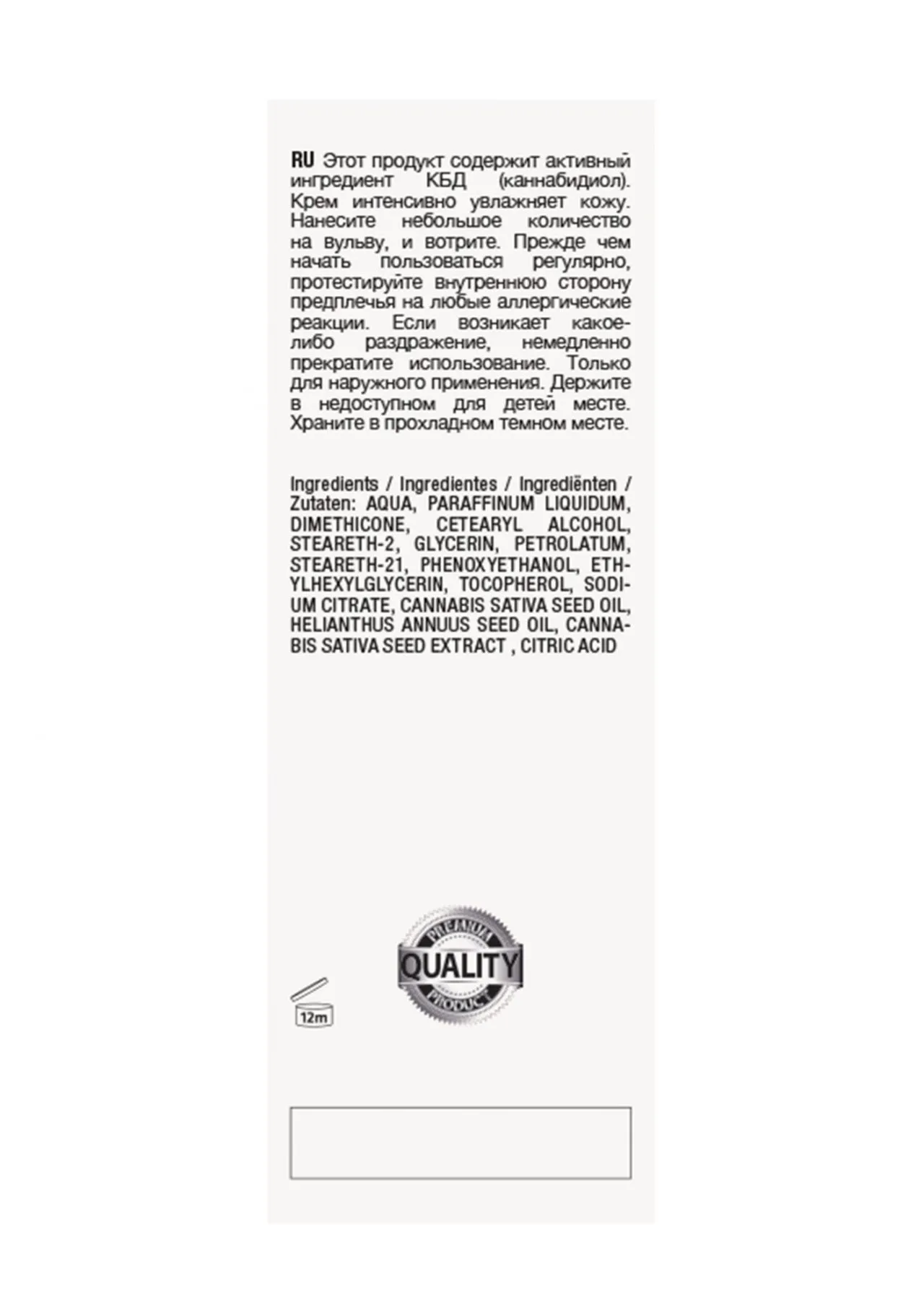 Вода, вазелиновое масло, диметикон, цетеариловый спирт, стеарет-2, глицерин, вазелин, стеарет-21, феноксиэтанол, этилгексилглицерин, токоферол, цитрат натрия, масло семян каннабиса посевного, масло семян подсолнечника однолетнего, экстракт семян каннабиса посевного, лимонная кислота.