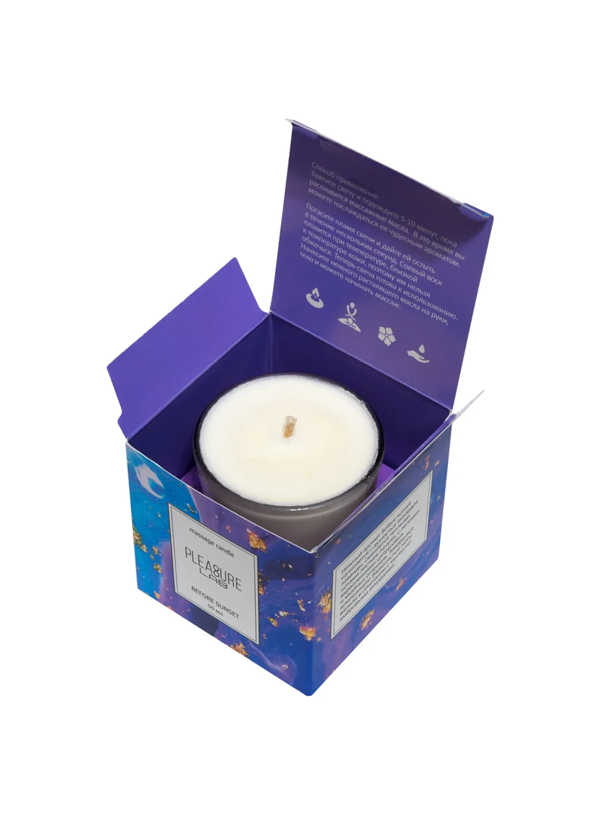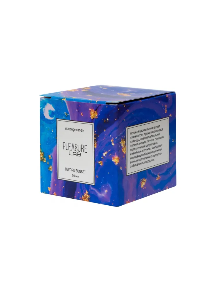 Массажная свеча Pleasure Lab - прекрасный проводник от легких заигрываний до страстного секса. Cвеча дарит ароматерапевтический эффект, позволяет расслабиться и создать интимную атмосферу. Свеча Before sunset обладает бархатисто-нежным ароматом с теплыми нотами пачули.  Состав: натуральный соевый воск, натуральные масла: ши (карите), миндальное, кунжутное, виноградных косточек, ароматическая композиция и хлопковый фитиль.  Способ применения: зажгите свечу и подождите 5-10 минут, пока расплавятся массажные масла. В это время вы можете наслаждаться её чудесным ароматом. Погасите пламя свечи и дайте ей остыть в течение нескольких секунд. Соевый воск плавится при температуре, близкой к температуре кожи, поэтому им нельзя обжечься. Теперь свеча готова к использованию. Нанесите немного растаявшего масла на руки, тело и можете начинать массаж. Время горения свечи - 5,5 часов. Условия хранения: хранить в темном месте при температуре от +7 до +20 градусов.