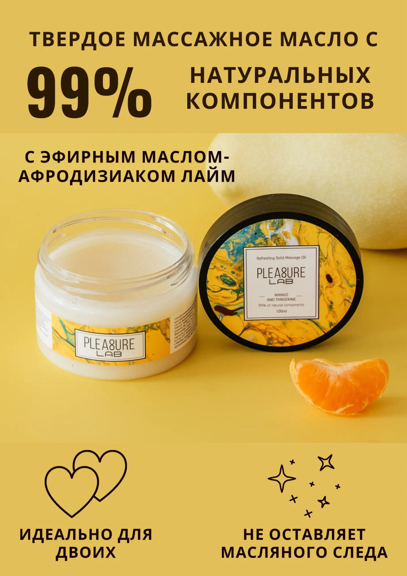 Pleasure Lab Refreshing с ароматом манго и мандарина, а также эфирным маслом-афродизиаком лайм мягко тонизирует и возбуждает яркими обертонами цитрусовых. Способ применения: разотрите небольшое количество масла в ладонях и медленно начните продвигаться массирующими движениями от ступней к спине и плечам партнера. Подходит для самомассажа. Состав: масло ши (карите), миндальное масло, масло кокосовое, масло зародышей пшеницы, масло манго, воск рисовых отрубей, парфюмерная композиция, эфирное масло мандарина, эфирное масло лайма, СК-СО2 экстракты (розмарин, лимон, облепиха, календула), натуральный антиоксидант (токоферол (смесь), бета-ситостерол, сквален), витамин Е. Срок годности- 2 года.