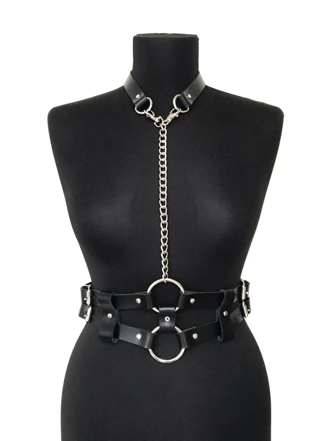 Портупея "Калипсо" от российского бренда Pink Rabbit сделана из натуральной кожи черного цвета и декорирована цепочкой, проходящей вдоль груди. Ремешки, соединенные между собой металлическими кольцами, образуют на талии замысловатый узор, напоминающий бондаж. 2 ремешка, обхватывающие талию, подчеркнут стройность фигуры.