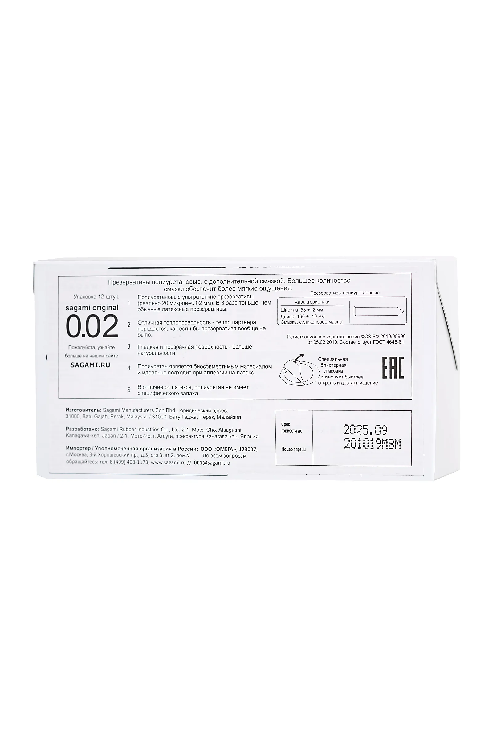 —Презервативы Sagami, original 0.02, extra lub, полиуретан, 19 см, 12 шт.