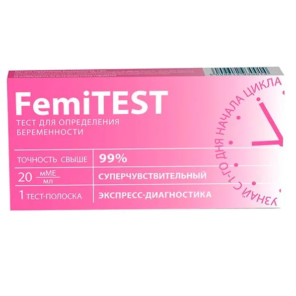 Femitest – это тест-полоска для определения беременности в домашних условиях. Действие теста основано на определении в моче женщины концентрации хорионического гонадотропина человека (ХГч) – это гормон, который начинает вырабатываться тканью хориона после имплантации эмбриона в стенку матки. Тест может определить беременность на ранних сроках с первого дня задержки, поскольку обладает высокой точностью.