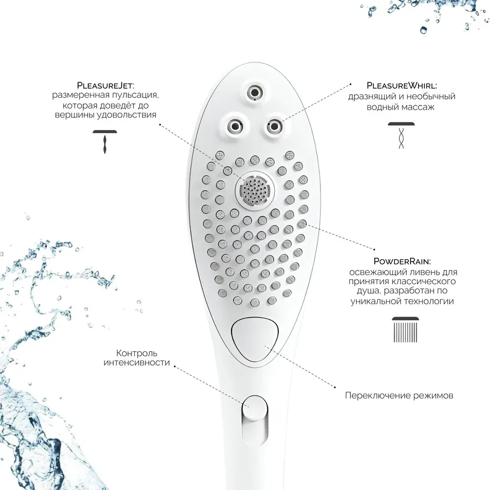 Wave устройство 2 в 1, которое можно использовать как обычную насадку для душа, так и в качестве клиторального стимулятора. 3 режима работы обеспечивают разнообразие ощущений от струй воды. PleasureJet и PleasureWhirl созданы специально для стимуляции деликатных зон, а режим PowderRain для обычного использования насадки в качестве лейки для душа. Простой в управлении Wave оснащен всего одной кнопкой на корпусе, которая отвечает за скорость и интенсивность подачи воды.
