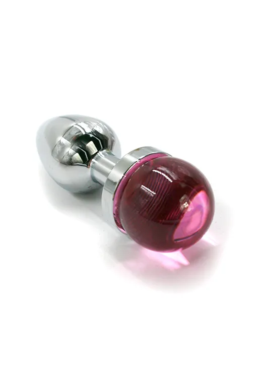 Анальная пробка из аллюминия размер S. Длина - 6 см, диаметр - 2,8 см, вес в 85 грамма. Изделие дополнено выпуклым украшением из стекла сферической формы розового цвета. Упакована в вельветовый мешочек для хранения.
