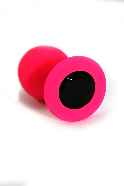 Анальная пробка из силикона розового цвета, размер M. Длина - 7 см, диаметр - 3,5 см, вес - 46,5 грамма. Страз в основании круглой формы, выполнен из стекла черного цвета. Упакована в вельветовый мешочек для хранения.