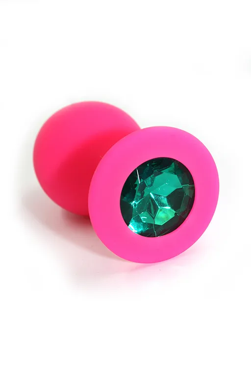 Анальная пробка из силикона розового цвета, размер M. Длина - 7 см, диаметр - 3,5 см, вес - 46,5 грамма. Страз в основании круглой формы, выполнен из стекла темно-зеленого цвета. Упакована в вельветовый мешочек для хранения.