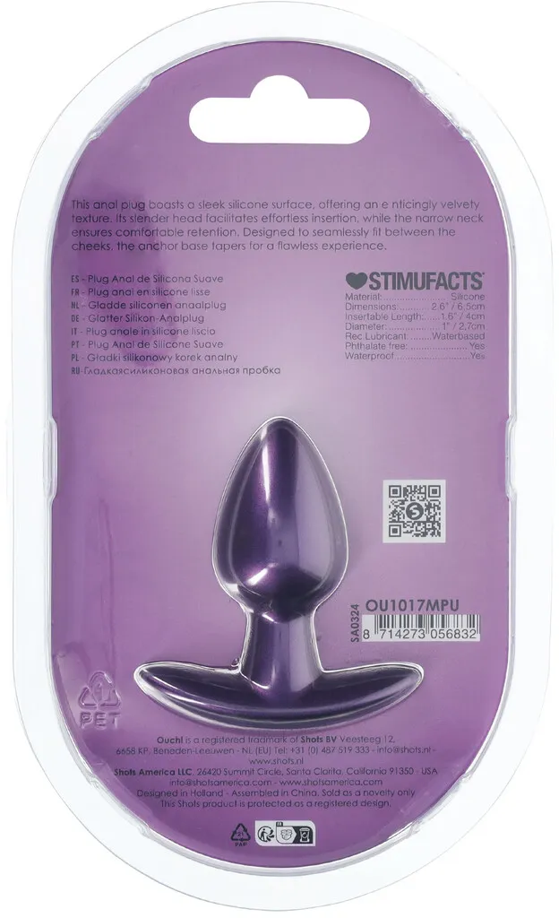 Анальная пробка Ouch! Small диаметром 2,7 см. в красивом металлическом цвете — это нечто особенное. Независимо от того, занимаетесь ли вы в одиночку или с партнёром, откройте для себя новые удовольствия с этой прекрасной мягкой силиконовой пробкой Ouch!. Анальная пробка, благодаря анатомической форме ограничителя, идеально подходит для ношения.