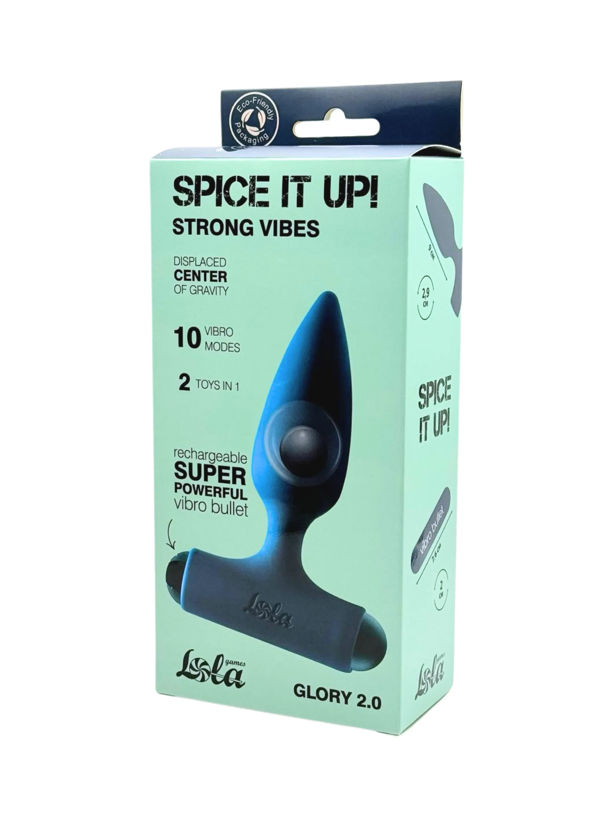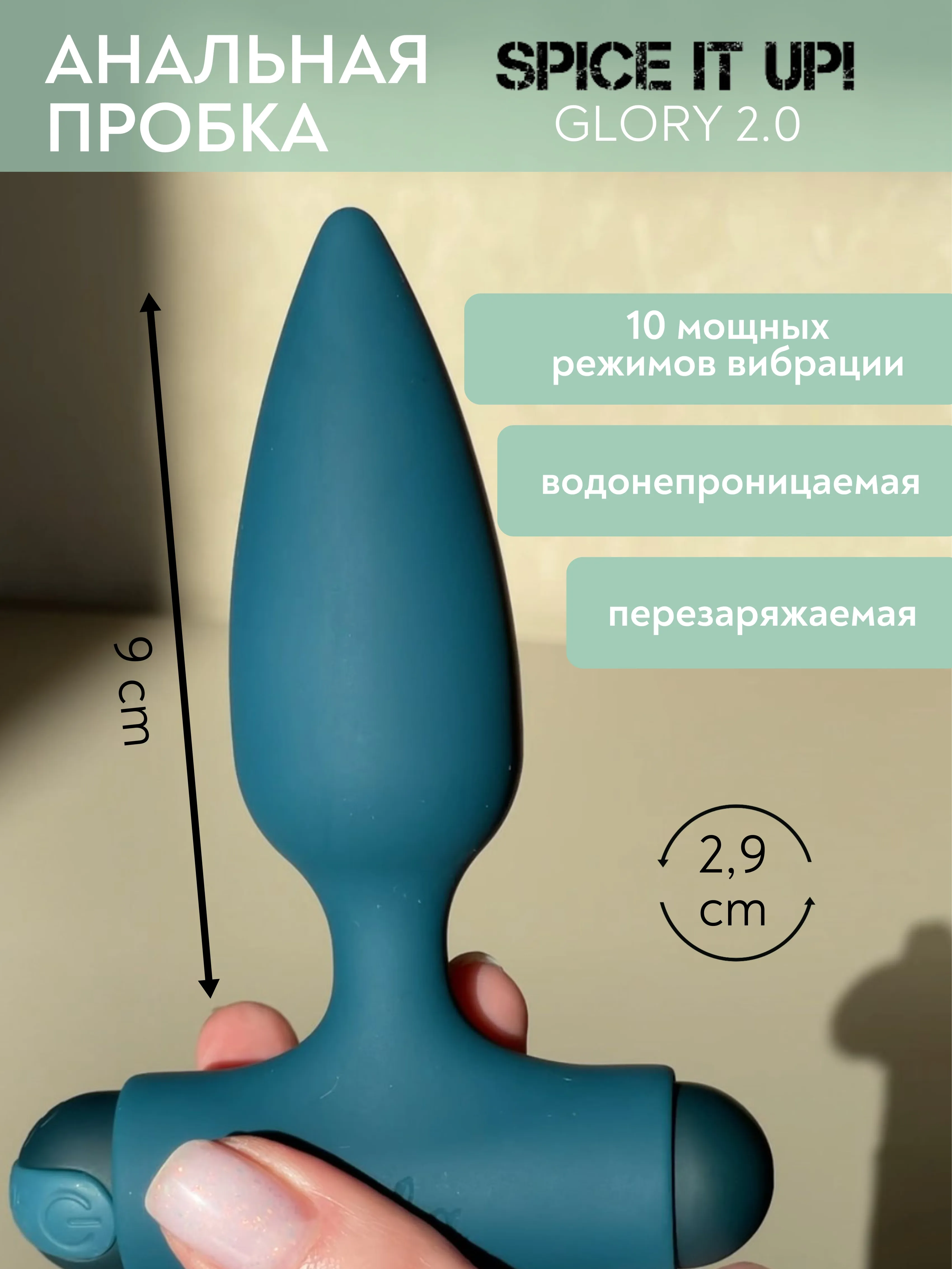 Анальная пробка Glory 2.0 с супер мощной перезаряжаемой вибропулей с 10 режимами вибрации – невероятно гибкая игрушка со смещенным центром тяжести, которая подойдет как новичкам, так и тем, кто хочет добавить азарта в свои анальные игры. Внутри пробки находится небольшой металлический шарик, покрытый силиконом. При каждом движении он будет ударять по пробке изнутри и создавать легкую бесшумную вибрацию. Рабочая длина пробки составляет 9 см, а диаметр - 2,9 см. Перезаряжаемая вибриропуля изготовлена из пластика, не содержащего фталатов, имеет водонепроницаемость IPX7 и 10 режимов вибрации. Полностью заряжается за 80 минут. Работает без перерыва 175 минут. Длина пули - 7,6 см, диаметр - 2 см.