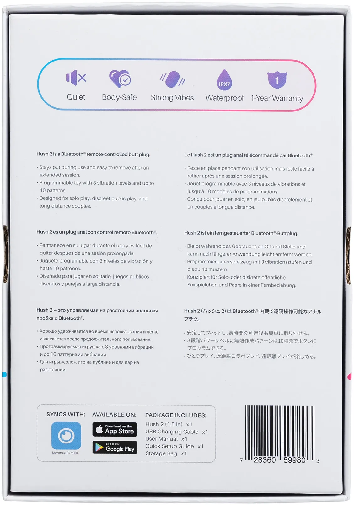 Lovense Hush 2 — это управляемая на расстоянии анальная пробка с Bluetooth. Размер M идеально подойдет для уверенных пользователей анальных практик. Полностью гладкое и бесшовное покрытие из медицинского силикона идеально подходит даже для длительного ношения,- просто выберите нужный вам уровень вибрации: низкий, средний или высокий, и наслаждайтесь ощущениями до 8-ми часов непрерывно. Шелковистый материал, узкий кончик и плавная форма обеспечивают комфортное введение, а выпуклая форма идеально соответствует естественной анатомии анального отверстия. Узкая ножка и широкий ограничитель гарантируют безопасность использования.