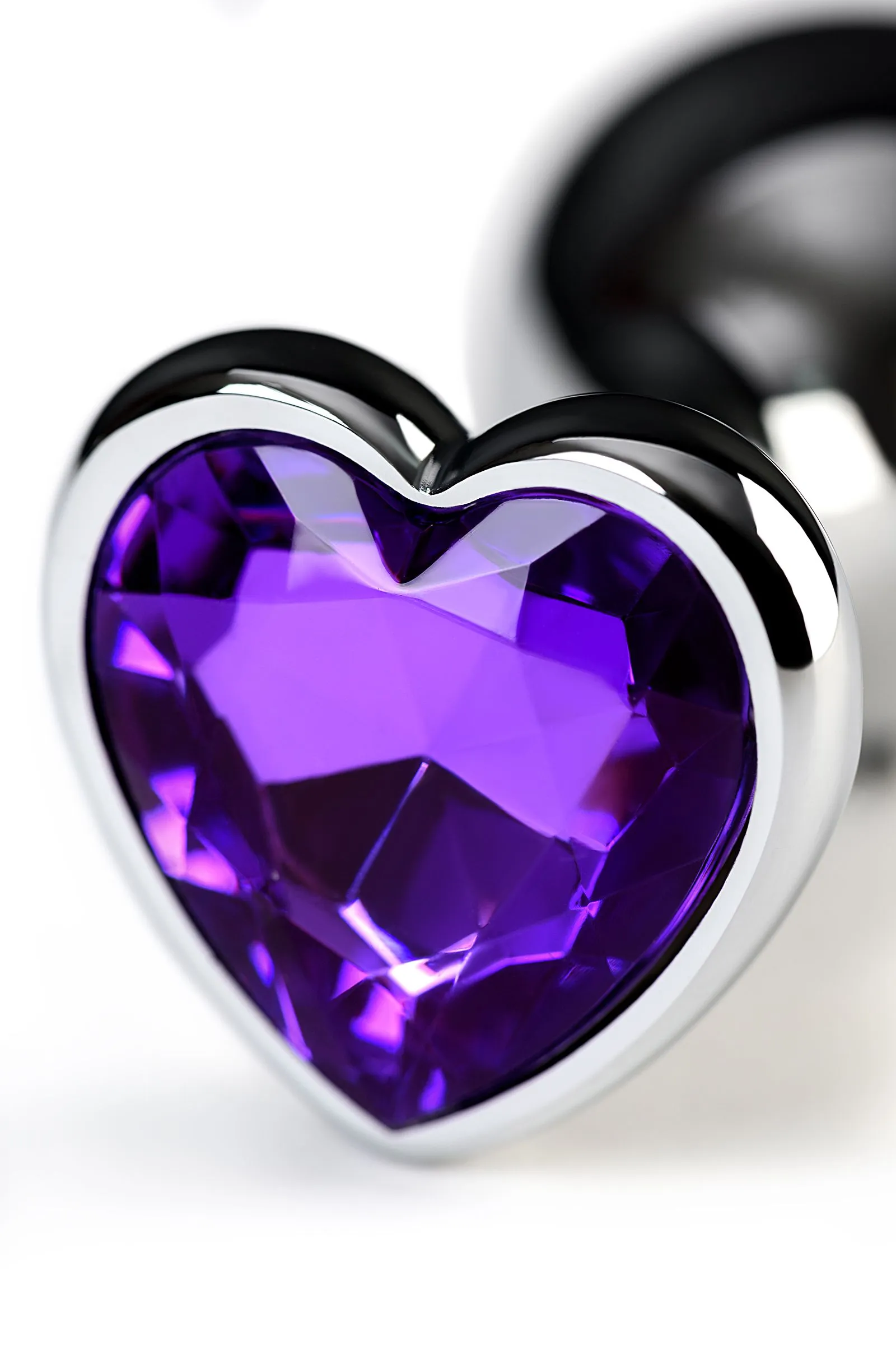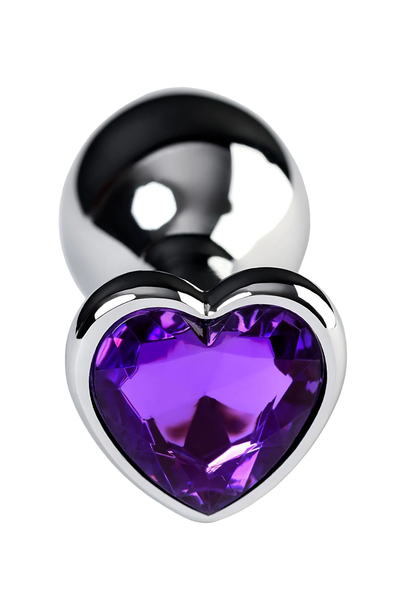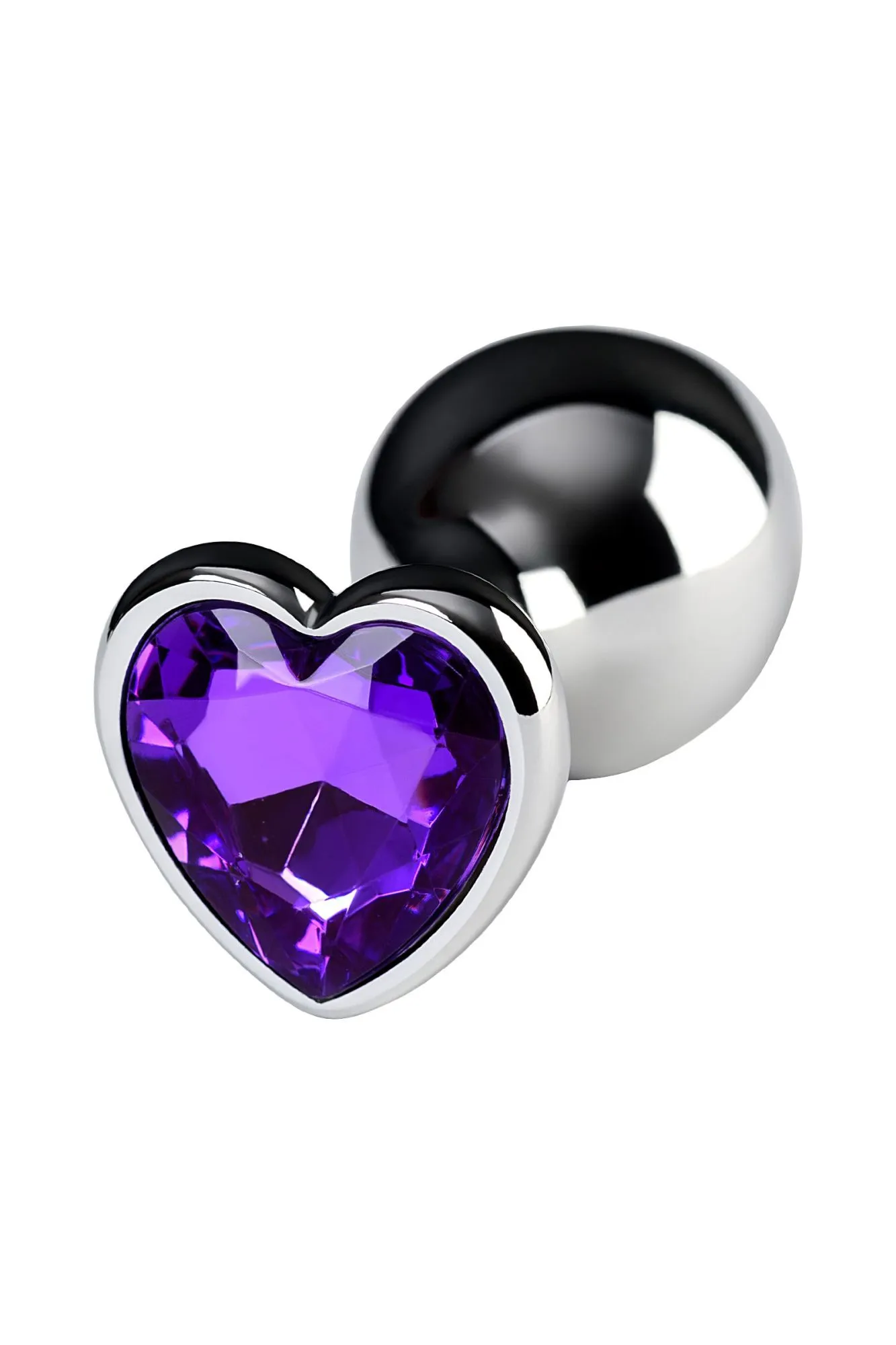 Серебристая анальная втулка из легкого сплава ощутима по форме, но комфортна по весу. Страз в форме сердечка цвета аметист украсит ваши игры.