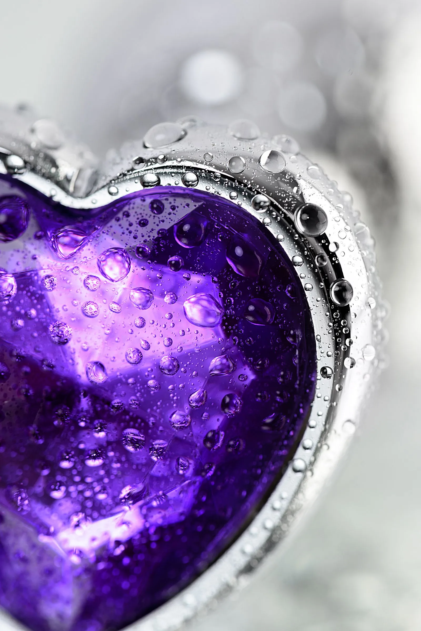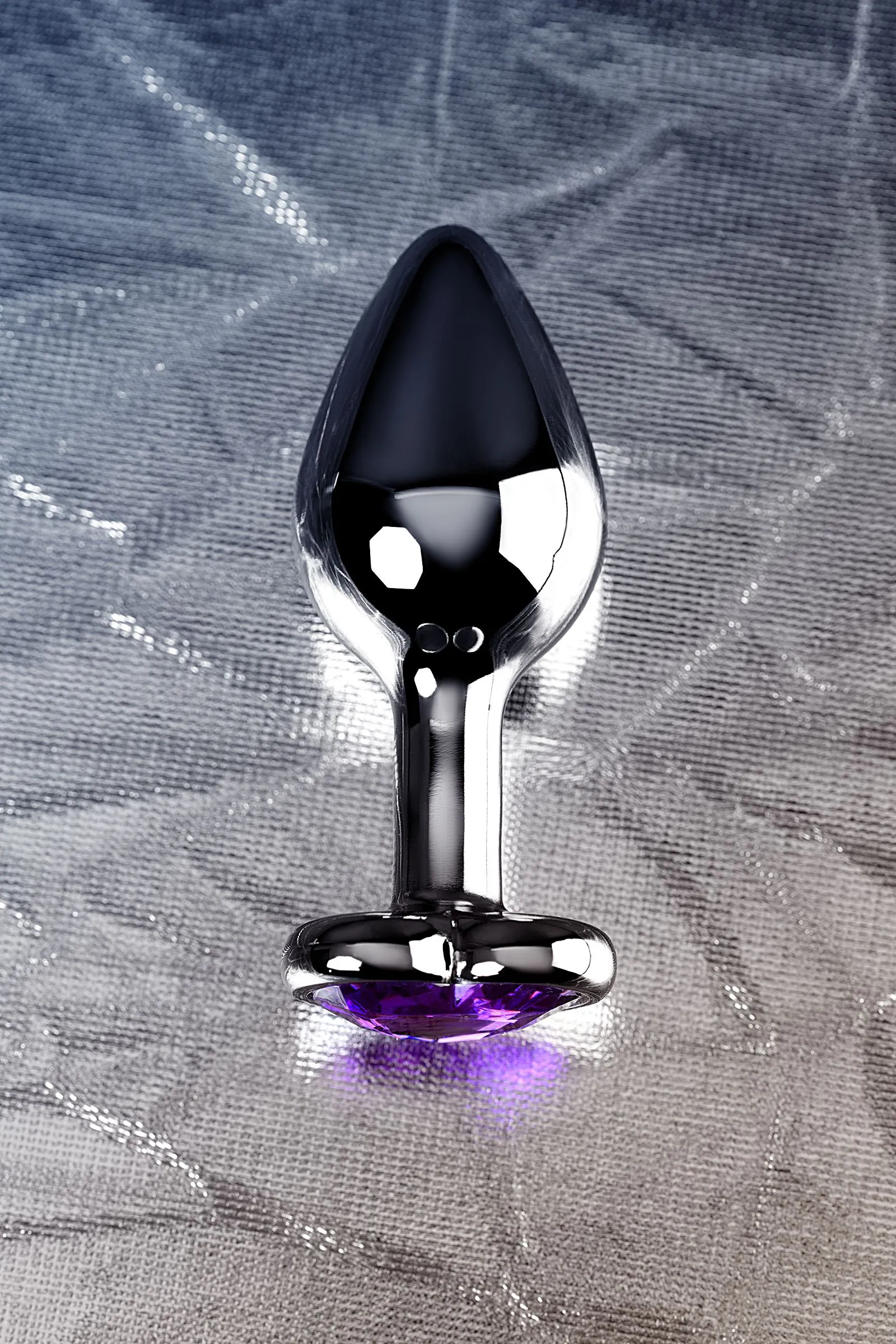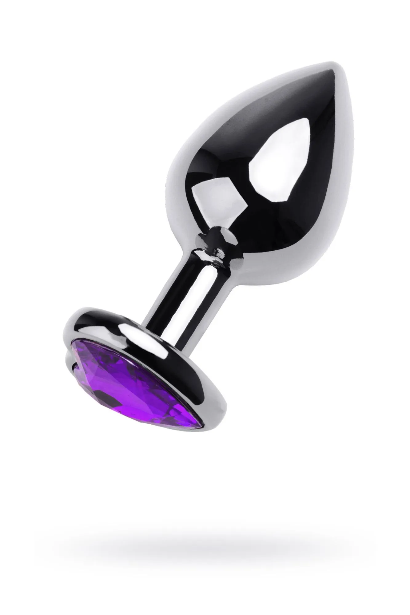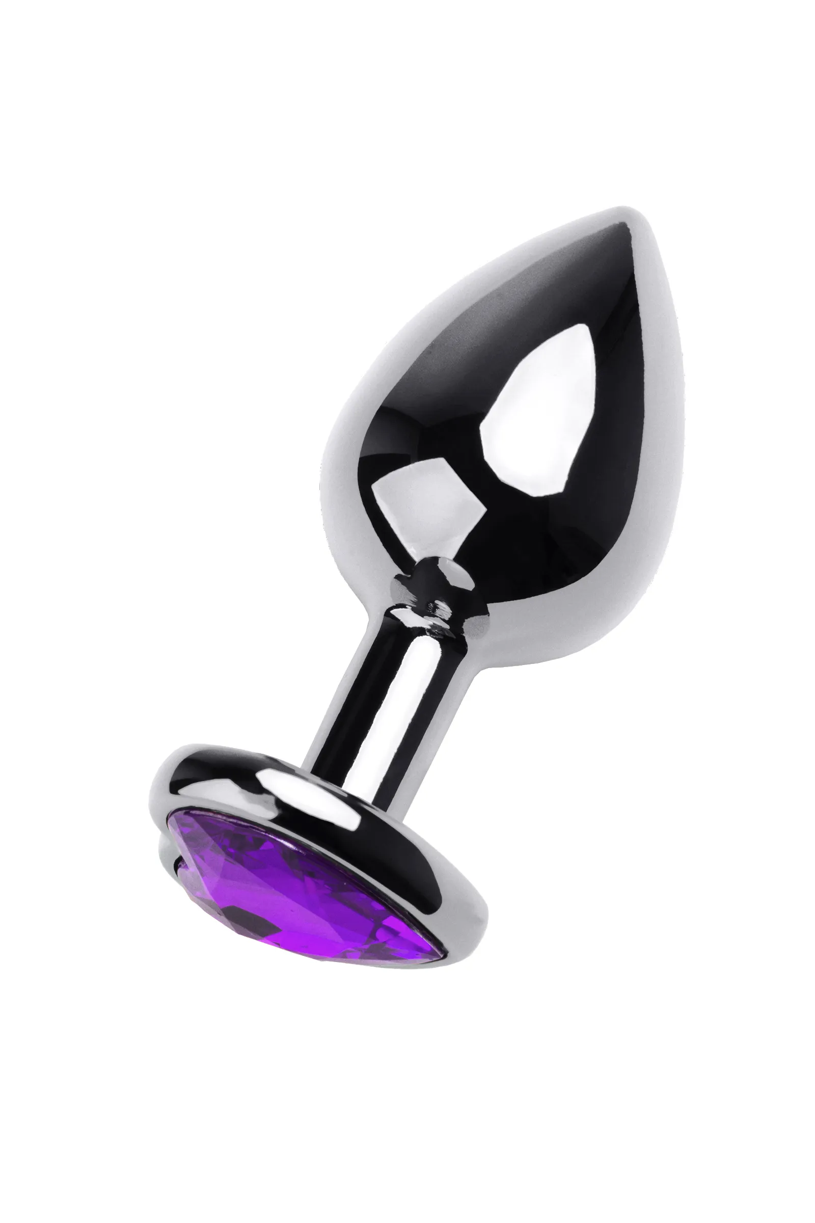 Серебристая анальная втулка из легкого сплава ощутима по форме, но комфортна по весу. Страз в форме сердечка цвета аметист украсит ваши игры.