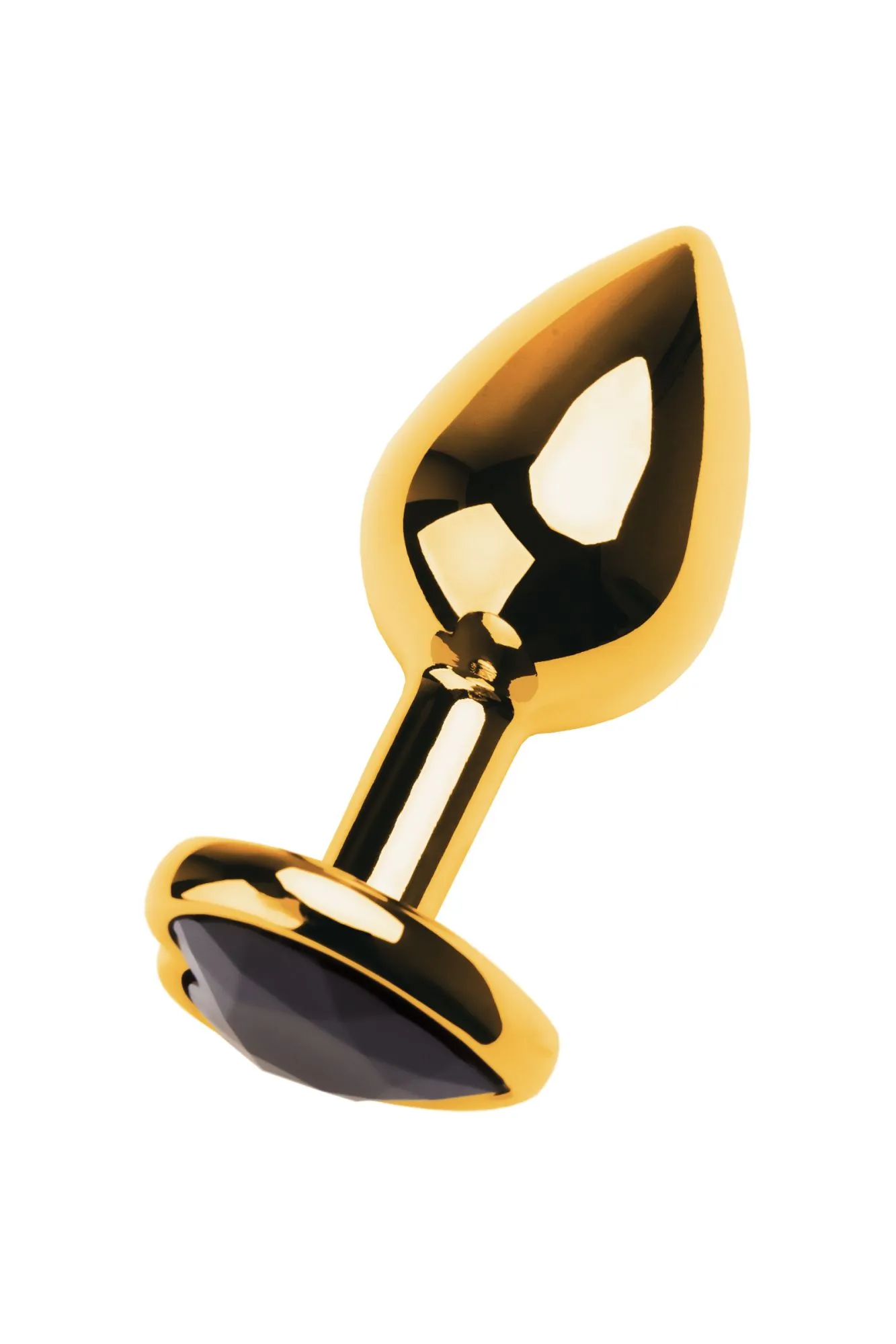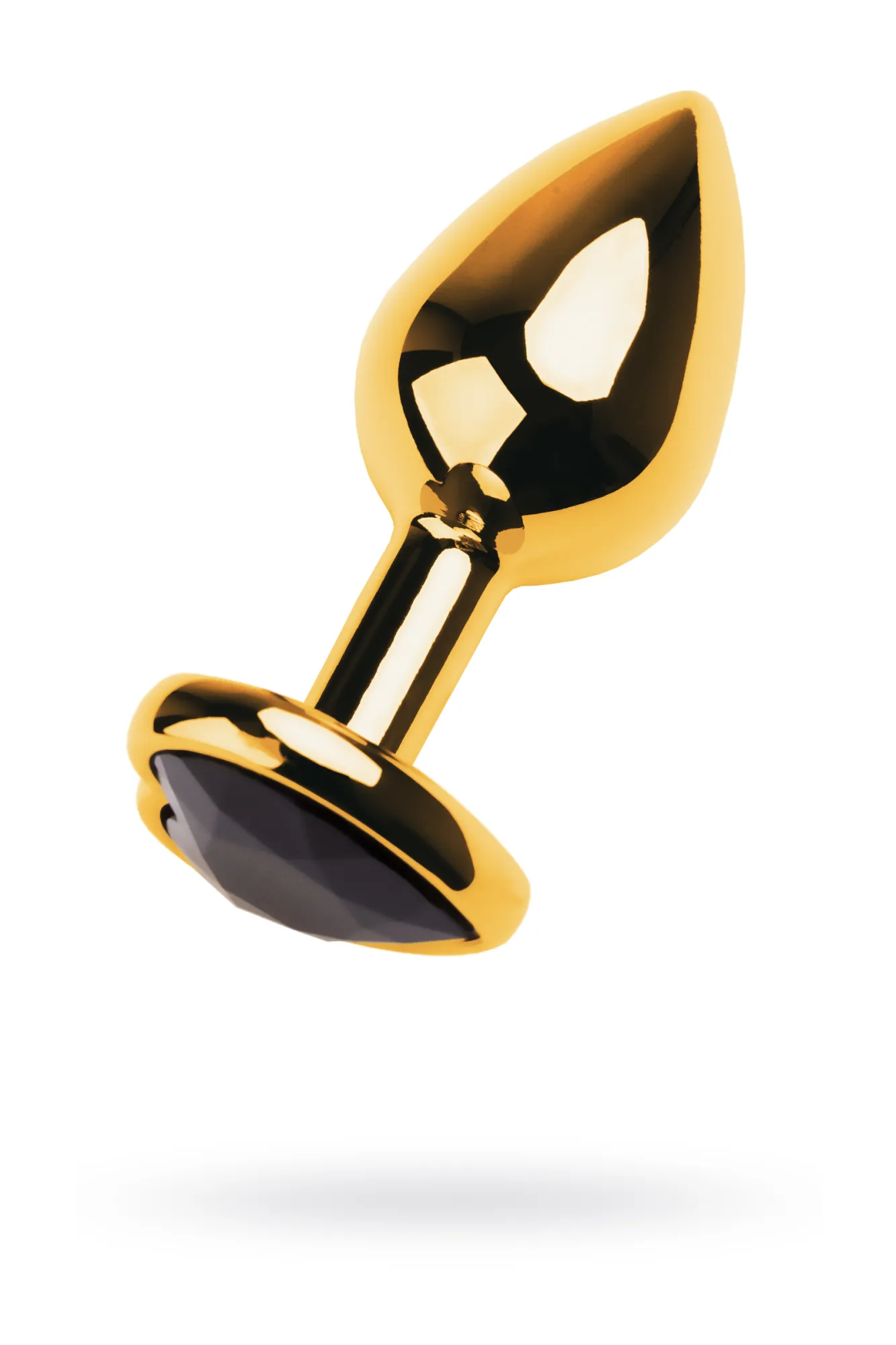 Золотистая анальная втулка из легкого сплава ощутима по форме, но комфортна по весу. Страз в форме сердечка цвета турмалин украсит ваши игры.