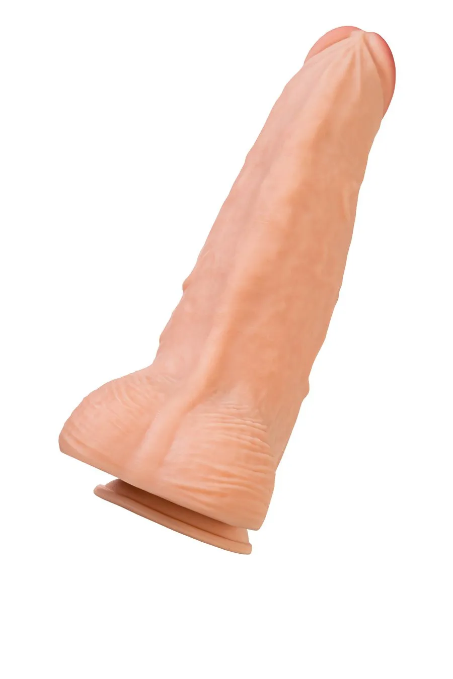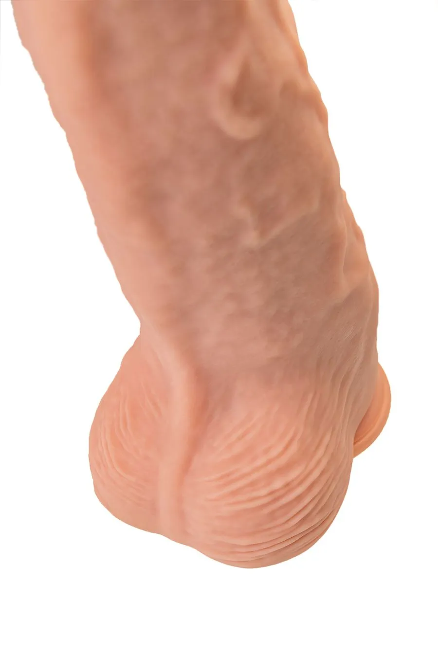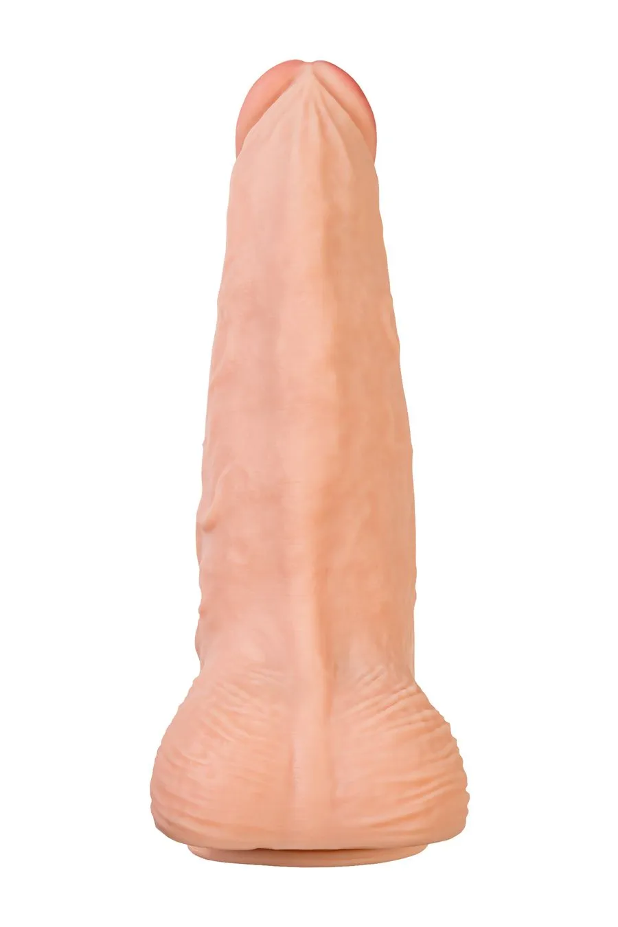 Конусная форма и мощная присоска на основании дают вам возможность экспериментировать с любыми позициями, а уменьшенная головка диаметром 6,7 см добавляет удобства в процессе использования. Рельефный ствол дарит не только физическое, но и эстетическое удовольствие. Рабочая длина фаллоса 33 смм, диаметр 11,5 см. Складочки на головке, выступающие венки и морщинистая мошонка дарят тактильное наслаждение.