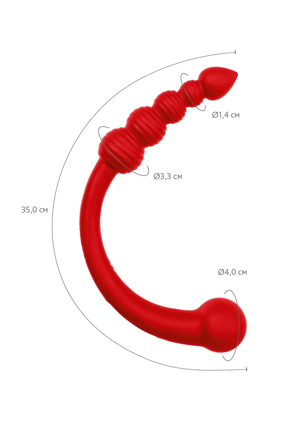- Анальная цепочка из 4 шариков с ребристой поверхностью (диаметр от 2,3 до 3,5 см) — создаёт волнующую стимуляцию чувствительных зон, постепенно увеличивая интенсивность ощущений. Заканчивается каплевидным наконечником для более легкого введения.