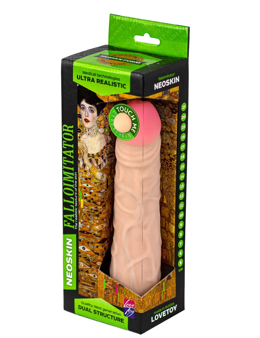 Фаллоимитатор на присоске имеет форму члена с ярко-выраженной головкой, рельефный, выполненный из сверхсовременного материала нового поколения "Неоскин", обладающий уникальными свойствами по пластичности, передающий эффект очень мягкой текстуры кожи. Характеристики: Общая длина- 22 см, рабочая длина- 20 см, максимальный диаметр - 4,8 см. Упаковка: картонная коробка с принтом.
