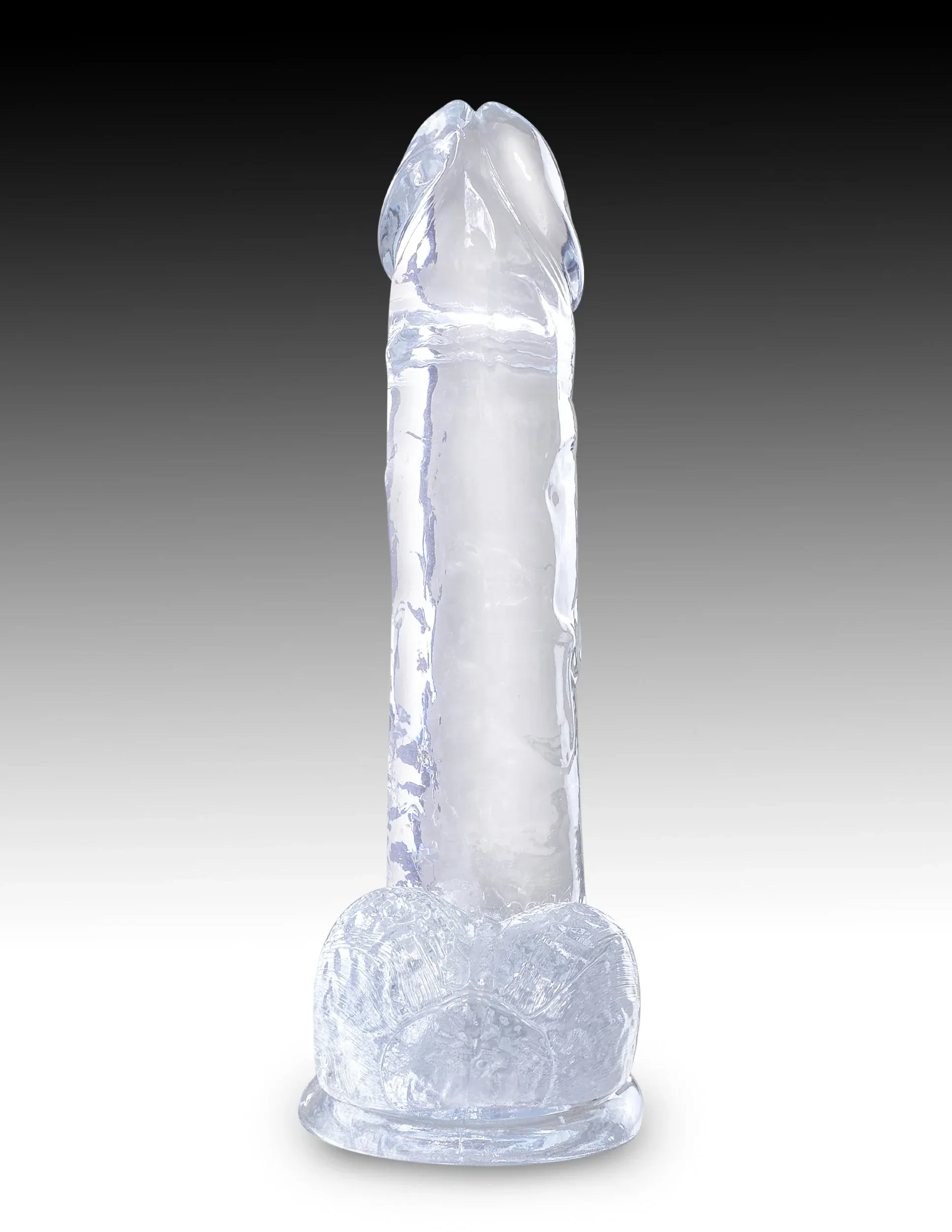 Фаллоимитатор King Cock Clear из прозрачного TPE (длина около 18 см). Гибкий ствол с деталями, присоска совместима с трусами для страпона. Без запаха, вес 0,39 кг. Легко чистить. Диаметр присоски - 7 см.