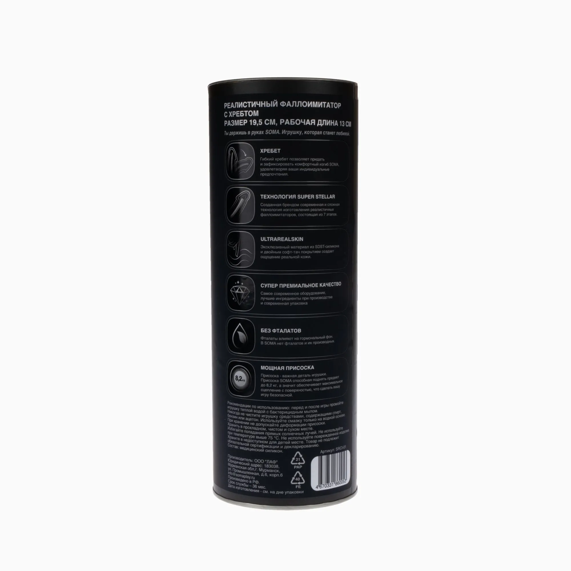 Только для тебя - товары для взрослых SOMA упакованы анонимно. Ваша покупка останется в секрете от посторонних глаз. Наши игрушки упакованы в тубы, в которых не повреждается присоска. Рекомендуем использовать с любыми лубрикантами и смазками за исключением силиконовых.