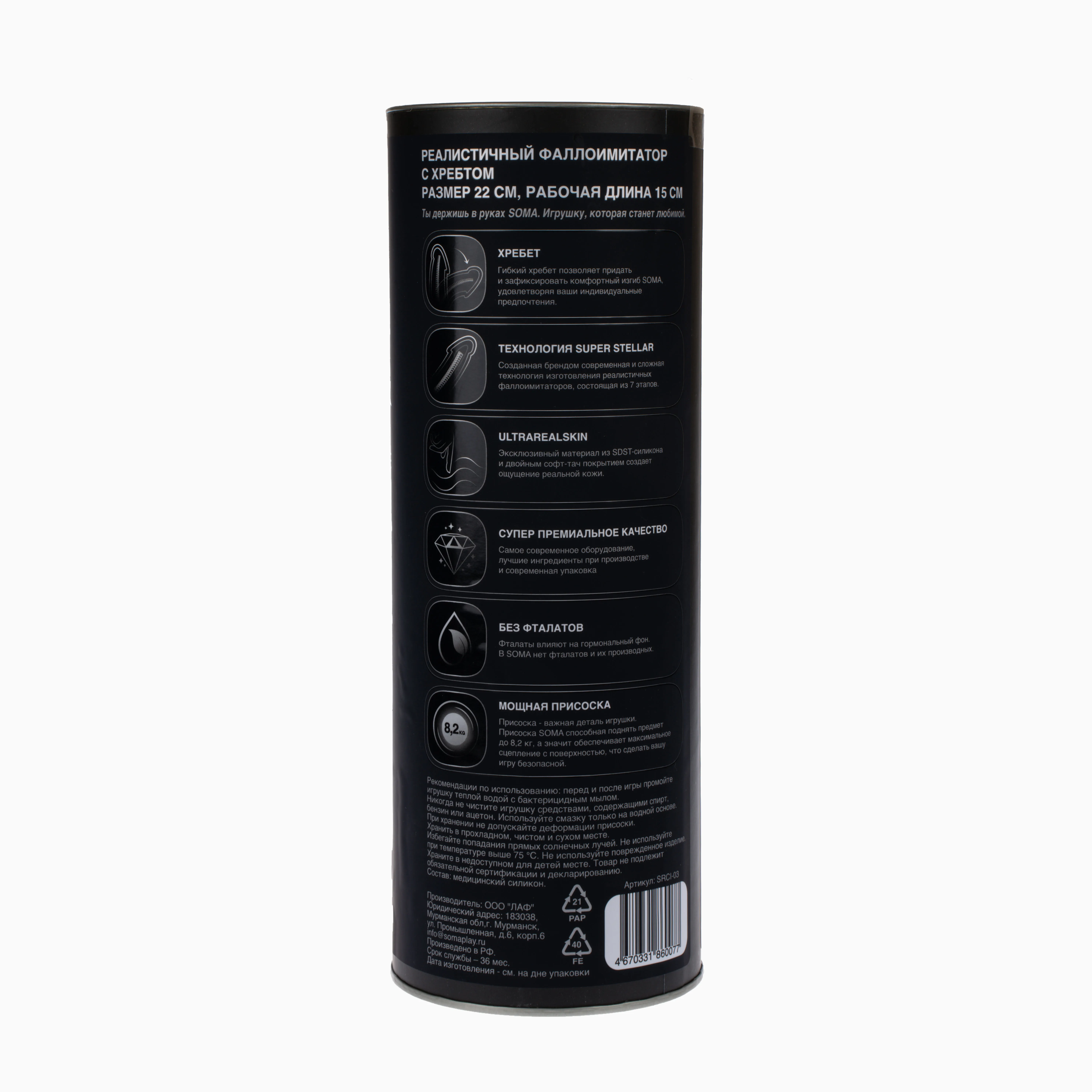 Только для тебя - товары для взрослых SOMA упакованы анонимно. Ваша покупка останется в секрете от посторонних глаз. Наши игрушки упакованы в тубы, в которых не повреждается присоска. Рекомендуем использовать с любыми лубрикантами и смазками за исключением силиконовых.