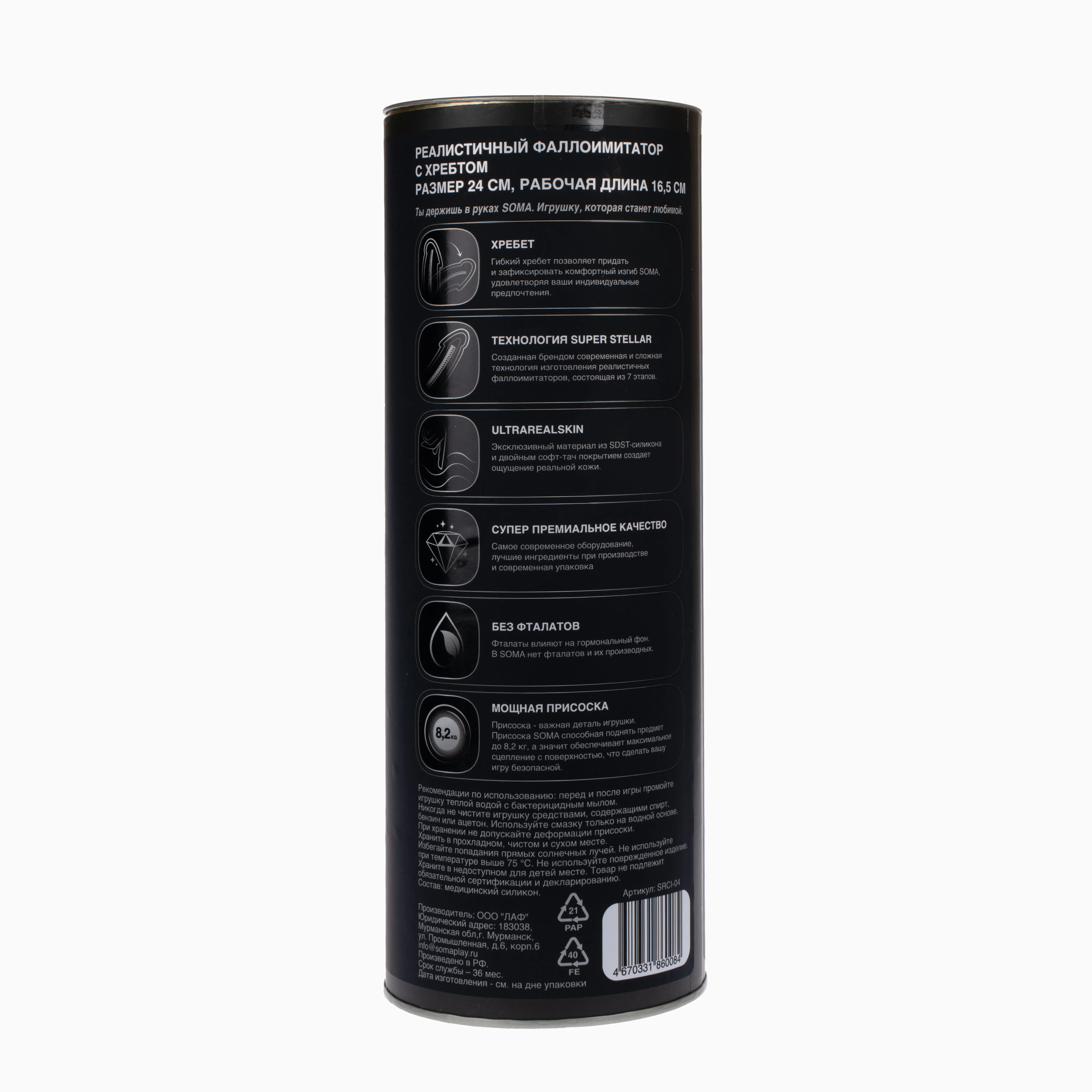 Только для тебя - товары для взрослых SOMA упакованы анонимно. Ваша покупка останется в секрете от посторонних глаз. Наши игрушки упакованы в тубы, в которых не повреждается присоска. Рекомендуем использовать с любыми лубрикантами и смазками за исключением силиконовых.