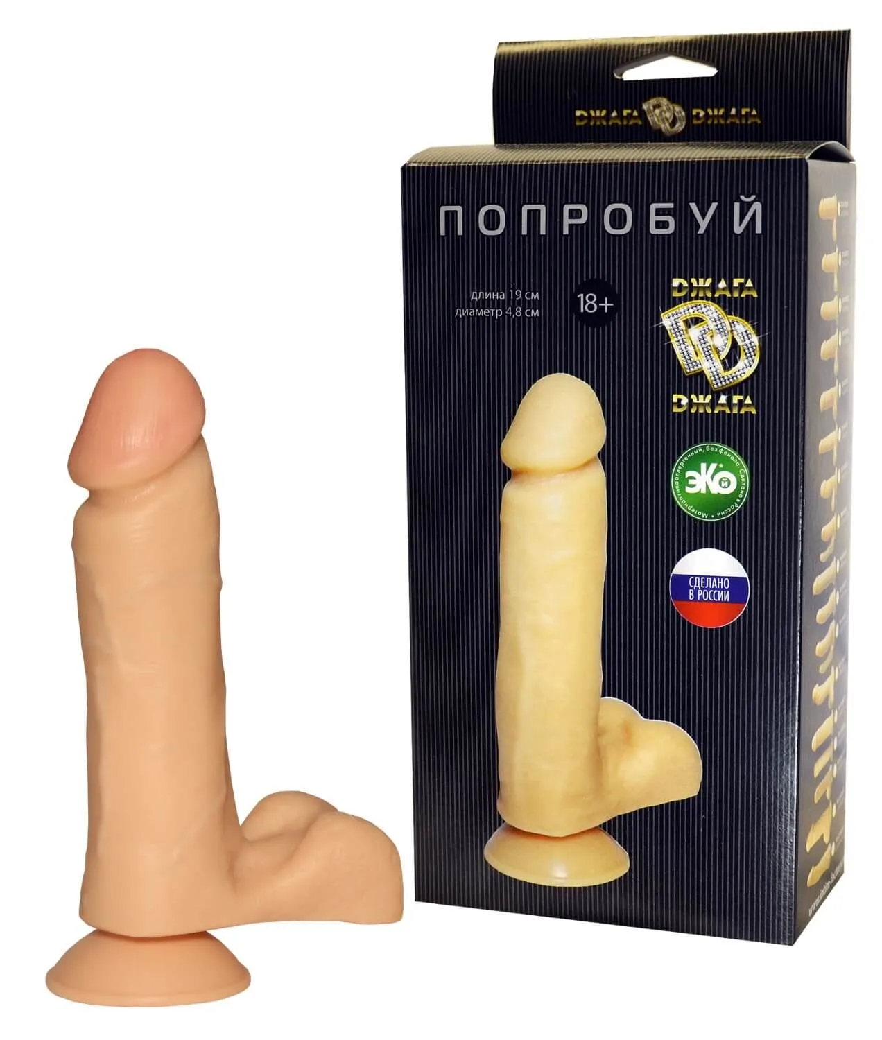 Dжага Dжага №1 - реалистичный фаллоимитатор с присоской. Выполнен из приятного на ощупь материала термопластичного эластомера со специальной добавкой Экой. Также он имеет мощную присоску, благодаря которой Вы сможете закрепить его на любой поверхности и тем самым освободить свои руки. Фаллоимитатор по текстуре плотный и рельефный, имеет слегка изогнутую головку, что позволяет стимулировать точку G. Легко моется в теплой воде с антибактериальным мылом.