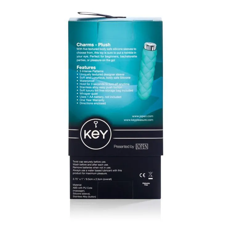 Charms Plush - это эксклюзивная игрушка с оригинальным дизайном. Компактный и удобный вибратор из премиум-коллекции Key может подарить Вам море наслаждения. Вибратор оснащен 5 различными режимами, включающими в себя вибрацию, пульсацию и функцию последовательного переключения с помощью одной кнопки. Силикон, из которого изготовлена игрушка, очень мягкий и бархатистый. Он обладает таким свойством, как принимать температуру тела, поэтому с этой игрушкой вы будете чувствовать себя комфортно. Поверхность игрушки рельефная и это обеспечивает дополнительную стимуляцию. В комплект также входит специальный чехол для хранения.